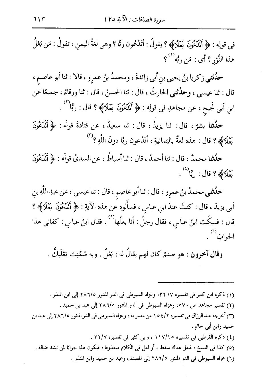 حَدَّثَنِي زَكَرِيَّا بْنُ يَحْيَى بْنِ أَبِي زَائِدَةَ، وَمُحَمَّدُ بْنُ عَمْرٍو، قَالَا: ثنا أَبُو عَاصِمٍ، قَالَ: ثنا عِيسَى، وَحَدَّثَنِي الْحَارِثُ، قَالَ: ثنا الْحَسَنُ، قَالَ: ثنا وَرْقَاءُ، جَمِيعًا عَنِ ابْنِ أَبِي نَجِيحٍ، عَنْ مُجَاهِدٍ، فِي قَوْلِهِ: {§أَتَدْعُونَ بَعْلًا} [الصافات: 125] قَالَ: رَبًّا "