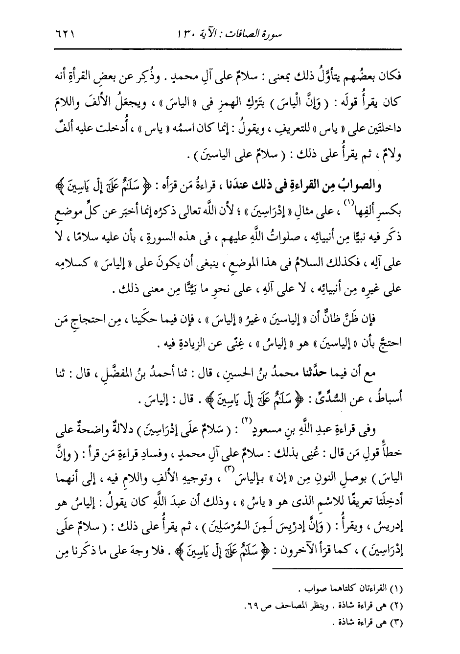 مَعَ أَنَّ فِيمَا: حَدَّثَنَا مُحَمَّدُ بْنُ الْحُسَيْنِ، قَالَ: ثنا أَحْمَدُ بْنُ الْمُفَضَّلِ، قَالَ: ثنا أَسْبَاطٌ، عَنِ السُّدِّيِّ (§سَلَامٌ عَلَى آلِ يَاسِينَ) قَالَ: «إِلْيَاسُ» وَفِي قِرَاءَةِ عَبْدِ اللَّهِ بْنِ مَسْعُودٍ: «سَلَامٌ عَلَى إِدرَاسِينَ» دَلَالَةٌ وَاضِحَةٌ عَلَى خَطَأِ قَوْلِ مَنْ قَالَ: عَنَى بِذَلِكَ: سَلَامٌ عَلَى آلِ مُحَمَّدٍ، وَفَسَادِ قِرَاءَةِ مَنْ قَرَأَ: «وَإِنَّ إِلْيَاسَ» بِوَصْلِ النُّونِ مِنْ إِنَّ بِالْيَاسَ، وَتَوْجِيهِ الْأَلْفَ وَاللَّامَ فِيهِ إِلَى أَنَّهُمَا أُدْخِلَتَا تَعْرِيفًا لِلِاسْمِ الَّذِي هُوَ يَاس، وَذَلِكَ أَنَّ عَبْدَ اللَّهِ كَانَ يَقُولُ: إِلْيَاسُ هُوَ إِدْرِيسُ، وَيَقْرَأُ: «وَإِنَّ إِدْرِيسَ لَمِنَ الْمُرْسَلِينَ» ، ثُمَّ يَقْرَأُ عَلَى ذَلِكَ: (سَلَامٌ عَلَى إِدْرَاسِينَ) كَمَا قَرَأَ الْآخَرُونَ: «سَلَامٌ عَلَى آلِ يَاسِينَ» فَلَا وَجْهَ عَلَى مَا ذَكَرْنَا مِنْ
