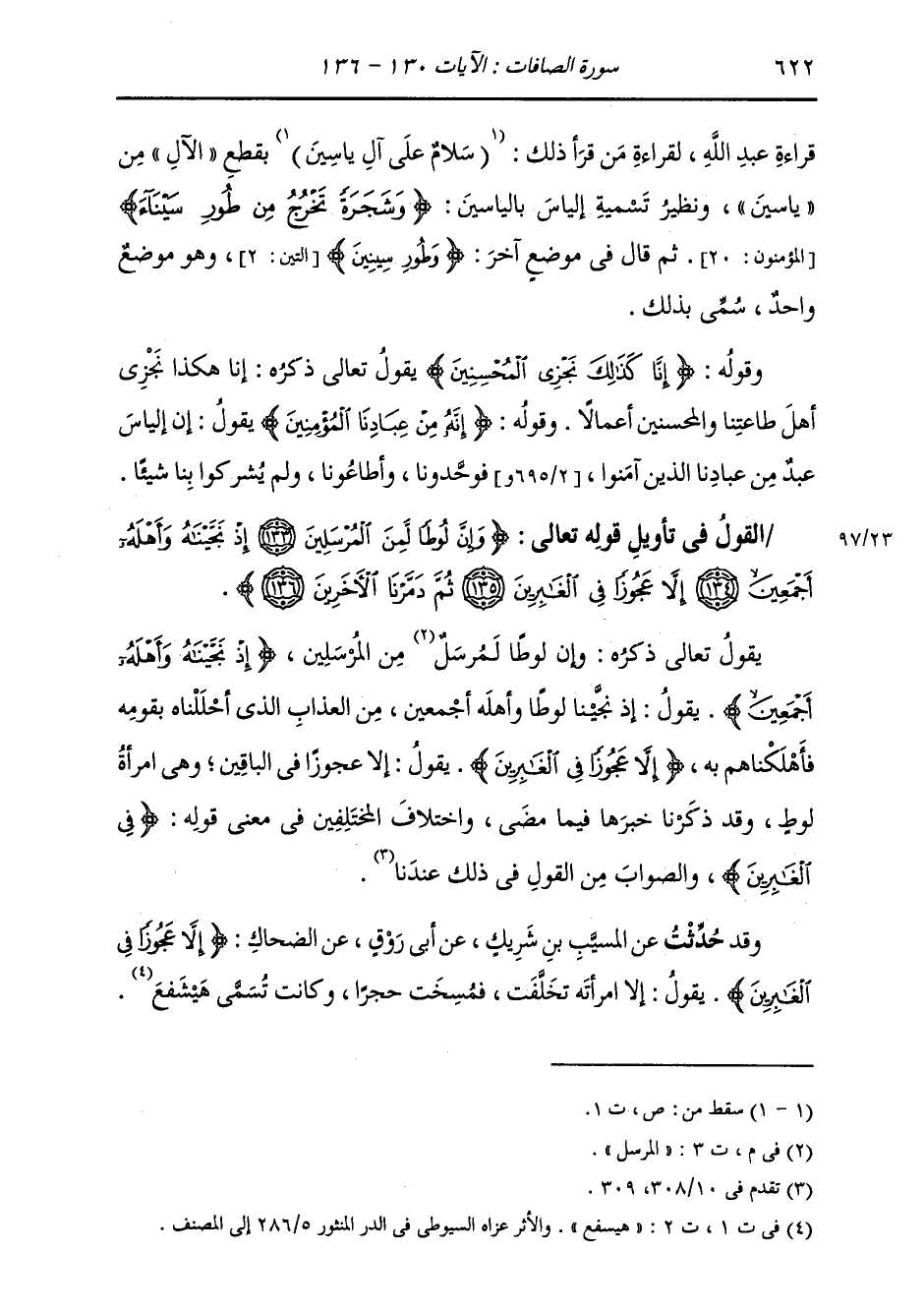 قِرَاءَةِ عَبْدِ اللَّهِ لِقِرَاءَةِ مَنْ قَرَأَ ذَلِكَ: (سَلَامٌ عَلَى آلِ يَاسِينَ) بِقَطْعِ الْآلِ مِنْ يَاسِينَ وَنَظِيرُ تَسْمِيَةِ إِلْيَاسَ بِآلِ يَاسِينَ: {وَشَجَرَةٌ تَخْرُجُ مِنْ طورِ سَيْنَاءَ} [المؤمنون: 20] ، ثُمَّ قَالَ فِي مَوْضِعٍ آخَرَ: {وَطُورِ سِينِينَ} [التين: 2] وَهُوَ مَوْضِعٌ وَاحِدٌ سُمَيَّ بِذَلِكَ