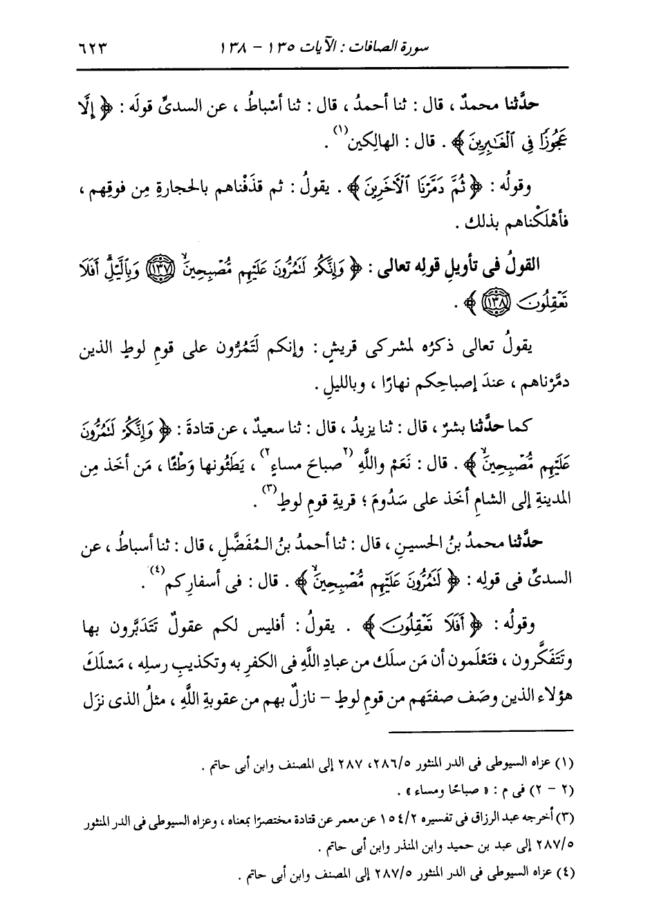 حَدَّثَنَا مُحَمَّدُ بْنُ الْحُسَيْنِ، قَالَ: ثنا أَحْمَدُ بْنُ الْمُفَضَّلِ، قَالَ: ثنا أَسْبَاطٌ، عَنِ السُّدِّيِّ، فِي قَوْلِهِ: {§لَتَمُرُّونَ عَلَيْهِمْ مُصْبِحِينَ} [الصافات: 137] قَالَ: «فِي أَسْفَارِكُمْ»