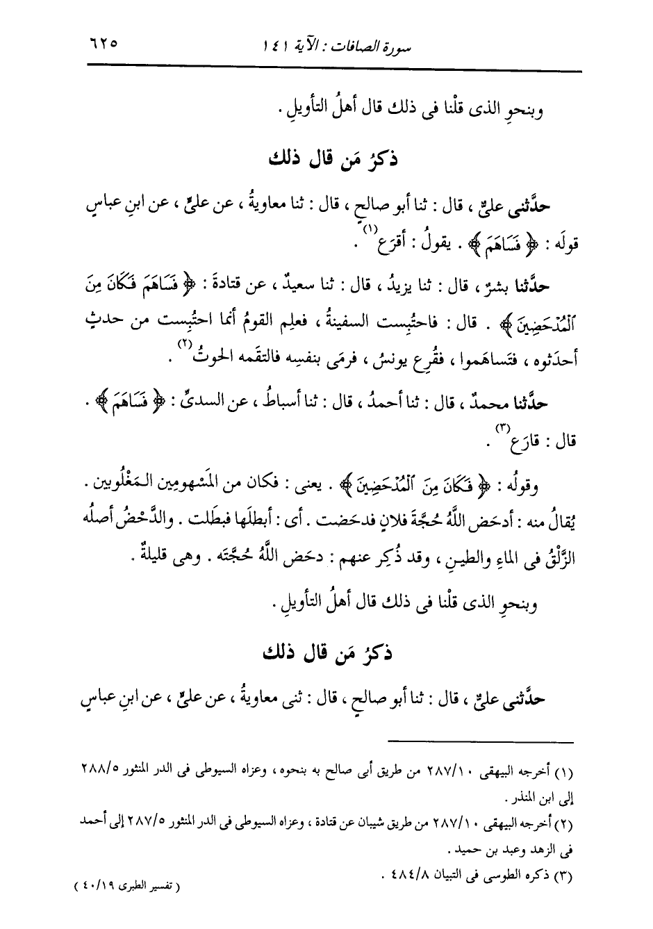 ذِكْرُ مَنْ قَالَ ذَلِكَ: حَدَّثَنِي عَلِيٌّ، قَالَ: ثنا أَبُو صَالِحٍ، قَالَ: ثني مُعَاوِيَةُ، عَنْ عَلِيٍّ، عَنِ ابْنِ عَبَّاسٍ، -[626]- قَوْلُهُ: {§فَكَانَ مِنَ الْمُدْحَضِينَ} [الصافات: 141] يَقُولُ: «مِنَ الْمَقْرُوعِينَ»