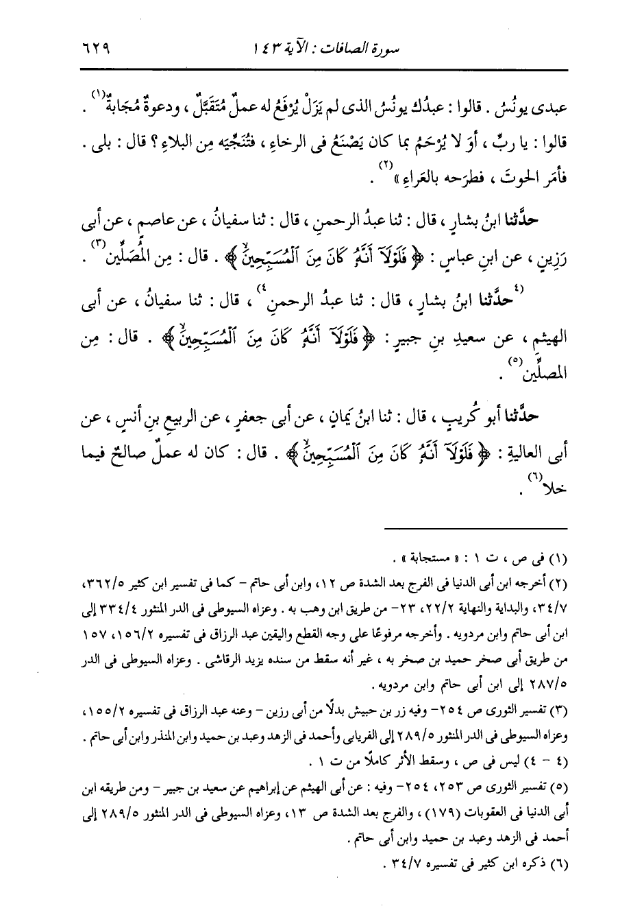 حَدَّثَنَا ابْنُ بَشَّارٍ، قَالَ: ثنا عَبْدُ الرَّحْمَنِ، قَالَ: ثنا سُفْيَانُ، عَنْ أَبِي الْهَيْثَمِ، عَنْ سَعِيدِ بْنِ جُبَيْرٍ {§فَلَوْلَا أَنَّهُ كَانَ مِنَ الْمُسَبِّحِينَ} [الصافات: 143] قَالَ: «مِنَ الْمُصَلِّينَ»
