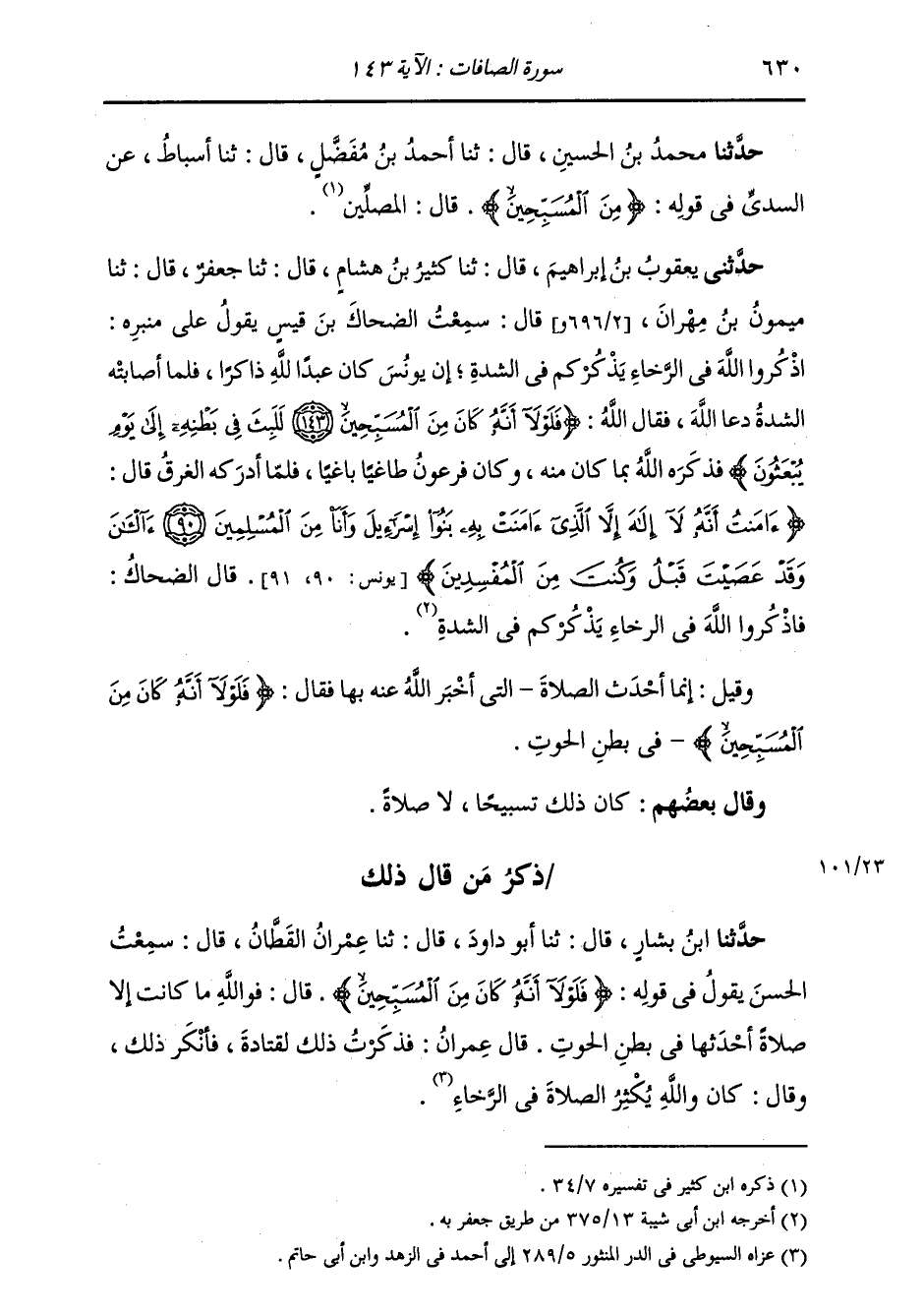حَدَّثَنَا مُحَمَّدُ بْنُ الْحُسَيْنِ، قَالَ: ثنا أَحْمَدُ بْنُ الْمُفَضَّلِ، قَالَ: ثنا أَسْبَاطٌ، عَنِ السُّدِّيِّ، فِي قَوْلِهِ: {§مِنَ الْمُسَبِّحِينَ} [الصافات: 143] قَالَ: «الْمُصَلِّينَ»