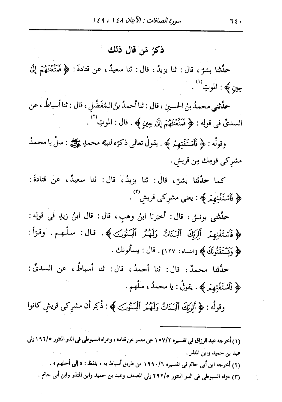 حَدَّثَنَا مُحَمَّدٌ، قَالَ: ثنا أَحْمَدُ، قَالَ: ثنا أَسْبَاطٌ، عَنِ السُّدِّيِّ {§فَاسْتَفْتِهِمْ} [الصافات: 149] يَقُولُ: «يَا مُحَمَّدُ سَلْهُمْ»