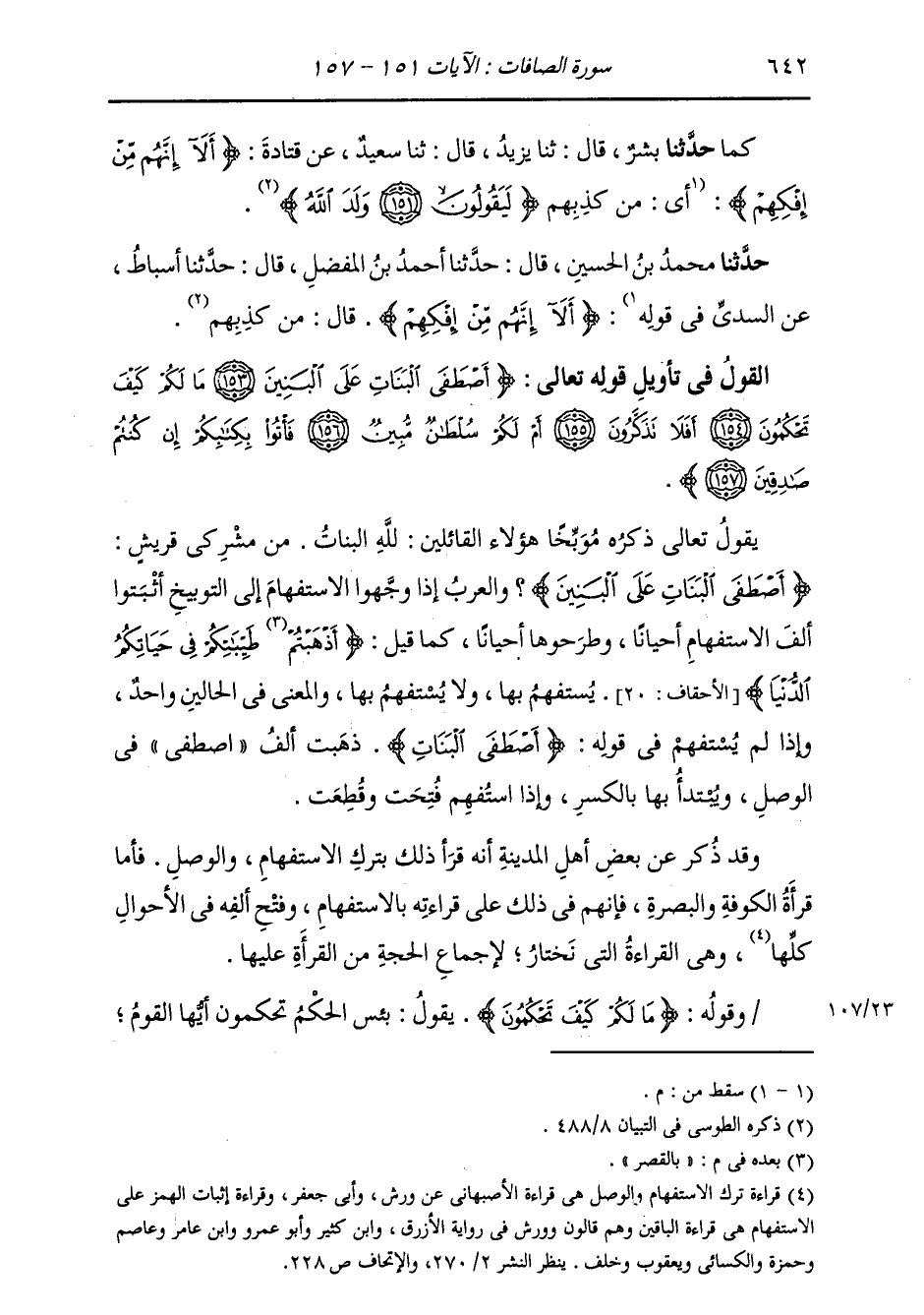 §الْقَوْلُ فِي تَأْوِيلِ قَوْلِهِ تَعَالَى: {أَصْطَفَى الْبَنَاتِ عَلَى الْبَنِينَ مَا لَكُمْ كَيْفَ تَحْكُمُونَ أَفَلَا تَذَكَّرُونَ أَمْ لَكُمْ سُلْطَانٌ مُبِينٌ فَأْتُوا بِكِتَابِكُمْ إِنْ كُنْتُمْ صَادِقِينَ} [الصافات: 154] يَقُولُ تَعَالَى ذِكْرُهُ مُوَبِّخًا هَؤُلَاءِ الْقَائِلِينَ لِلَّهِ الْبَنَاتُ مِنْ مُشْرِكِي قُرَيْشٍ: {أَصْطَفَى} [الصافات: 153] اللَّهُ أَيُّهَا الْقَوْمُ {الْبَنَاتِ عَلَى الْبَنِينَ} [الصافات: 153] ؟ وَالْعَرَبُ إِذَا وَجَّهُوا الِاسْتِفْهَامَ إِلَى التَّوْبِيخِ اثْبَتُوا أَلِفَ الِاسْتِفْهَامِ أَحْيَانًا وَطَرَحُوهَا أَحْيَانًا، كَمَا قِيلَ: {أَذَهَبْتُمْ} [الأحقاف: 20] بِالْقَصْرِ {طَيِّبَاتِكُمْ فِي حَيَاتِكُمُ الدُّنْيَا} [الأحقاف: 20] يَسْتَفْهِمُ بِهَا، وَلَا يَسْتَفْهِمُ بِهَا، وَالْمَعْنَى فِي الْحَالَيْنِ وَاحِدٌ، وَإِذَا لَمْ يَسْتَفْهِمْ فِي قَوْلِهِ: {أَصْطَفَى الْبَنَاتِ} [الصافات: 153] ذَهَبَتْ أَلِفُ اصْطَفَى فِي الْوَصْلِ، وَيُبْتَدَأُ بِهَا بِالْكَسْرِ، وَإِذَا اسْتَفْهَمَ فُتِحَتْ وَقُطِعَتْ وَقَدْ ذُكِرَ عَنْ بَعْضِ أَهْلِ الْمَدِينَةِ أَنَّهُ قَرَأَ ذَلِكَ بِتَرْكِ الِاسْتِفْهَامِ وَالْوَصْلِ فَأَمَّا قُرَّاءُ الْكُوفَةِ وَالْبَصْرَةِ، فَإِنَّهُمْ فِي ذَلِكَ عَلَى قِرَاءَتِهِ بِالِاسْتِفْهَامِ، وَفَتْحِ أَلِفِهِ فِي الْأَحْوَالِ كُلِّهَا، وَهِيَ الْقِرَاءَةُ الَّتِي نَخْتَارُ لِإِجْمَاعِ الْحُجَّةِ مِنَ الْقُرَّاءِ عَلَيْهَا