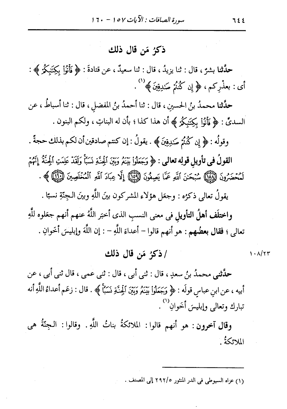 ذِكْرُ مَنْ قَالَ ذَلِكَ: حَدَّثَنَا بِشْرٌ، قَالَ: ثنا يَزِيدُ، قَالَ: ثنا سَعِيدٌ، عَنْ قَتَادَةَ {§فَأْتُوا بِكِتَابِكُمْ} [الصافات: 157] : «أَيْ بِعُذْرِكُمْ» {إِنَّ كُنْتُمْ صَادِقِينَ} [البقرة: 23]