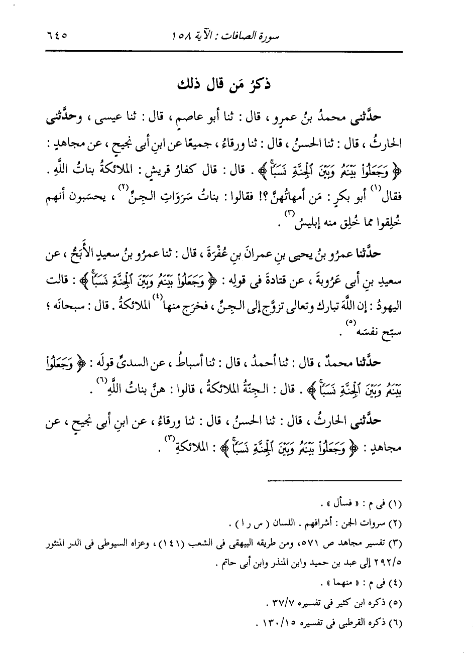 ذِكْرُ مَنْ قَالَ ذَلِكَ: حَدَّثَنِي مُحَمَّدُ بْنُ عَمْرٍو، قَالَ: ثنا أَبُو عَاصِمٍ، قَالَ: ثنا عِيسَى، وَحَدَّثَنِي الْحَارِثُ، قَالَ: ثنا الْحَسَنُ، قَالَ: ثنا وَرْقَاءُ، جَمِيعًا عَنِ ابْنِ أَبِي نَجِيحٍ، عَنْ مُجَاهِدٍ: {§وَجَعَلُوا بَيْنَهُ وَبَيْنَ الْجَنَّةِ نَسَبًا} [الصافات: 158] قَالَ: " قَالَ كُفَّارُ قُرَيْشٍ: الْمَلَائِكَةُ بَنَاتُ اللَّهِ، فَسَأَلَ أَبُو بَكْرٍ: مِنْ أُمَّهَاتُهُنَّ؟ فَقَالُوا: بَنَاتُ سَرَوَاتِ الْجِنِّ، يَحْسَبُونَ أَنَّهُمْ خُلِقُوا مِمَّا خُلِقَ مِنْهُ إِبْلِيسُ "
