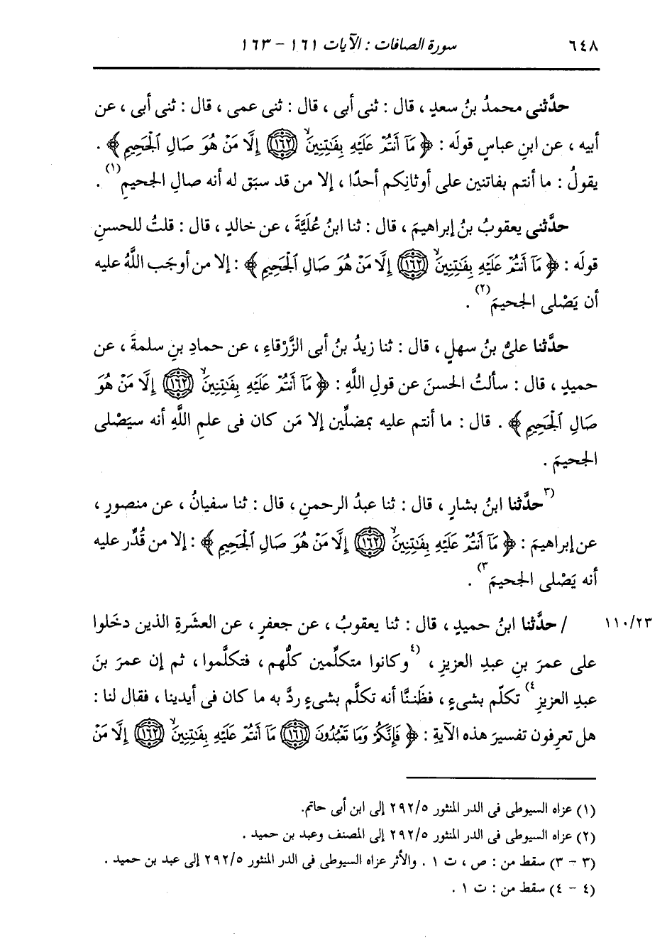 §حَدَّثَنَا ابْنُ بَشَّارٍ، قَالَ: ثنا عَبْدُ الرَّحْمَنِ، قَالَ: ثنا سُفْيَانُ، عَنْ مَنْصُورٍ، عَنْ إِبْرَاهِيمَ، {مَا أَنْتُمْ عَلَيْهِ بِفَاتِنِينَ إِلَّا مَنْ هُوَ صَالِ الْجَحِيمِ} [الصافات: 163] : «إِلَّا مَنْ قُدِّرَ عَلَيْهِ أَنَّهُ يَصْلَى الْجَحِيمَ»