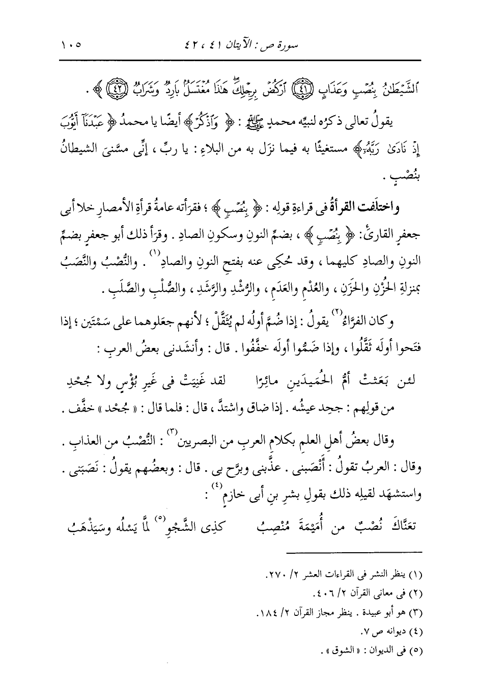 الشَّيْطَانُ بِنُصْبٍ وَعَذَابٍ ارْكُضْ بِرِجْلِكَ هَذَا مُغْتَسَلٌ بَارِدٌ وَشَرَابٌ} [ص: 42] يَقُولُ تَعَالَى ذِكْرُهُ لِنَبِيِّهِ مُحَمَّدٍ صَلَّى اللهُ عَلَيْهِ وَسَلَّمَ: {وَاذْكُرْ} [آل عمران: 41] أَيْضًا يَا مُحَمَّدُ {عَبْدَنَا أَيُّوبَ إِذْ نَادَى رَبَّهُ} [ص: 41] مُسْتَغِيثًا بِهِ فِيمَا نَزَلَ بِهِ مِنَ الْبَلَاءِ: يَا رَبِّ {أَنِّي مَسَّنِيَ الشَّيْطَانُ بِنُصْبٍ} [ص: 41] فَاخْتَلَفْتُ الْقُرَّاءُ فِي قِرَاءَةِ قَوْلِهِ: {بِنُصْبٍ} [ص: 41] فَقَرَأَتْهُ عَامَّةُ قُرَّاءِ الْأَمْصَارِ خَلَا أَبِي جَعْفَرٍ الْقَارِئِ: {بِنُصْبٍ} [ص: 41] بِضَمِّ النُّونِ وَسُكُونِ الصَادِ، وَقَرَأَ ذَلِكَ أَبُو جَعْفَرٍ: بِضَمِّ النُّونِ وَالصَادِ كِلَيْهِمَا، وَقَدْ حُكِيَ عَنْهُ بِفَتْحِ النُّونِ وَالصَادِ؛ وَالنُّصُبُ وَالنَّصُبُ بِمَنْزِلَةِ الْحُزْنِ وَالْحَزَنِ، وَالْعُدْمِ وَالْعَدَمِ، وَالرُّشْدِ وَالرَّشَدِ، وَالصُّلْبِ وَالصَّلَبِ وَكَانَ الْفَرَّاءُ يَقُولُ: إِذَا ضُمَّ أَوَّلُهُ لَمْ يَثْقُلْ، لِأَنَّهُمْ جَعَلُوهُمَا عَلَى سِمَتَيْنِ: إِذَا فَتَحُوا أَوَّلَهُ ثَقَّلُوا، وَإِذَا ضَمُّوا أَوَّلَهُ خَفَّفُوا قَالَ: وَأَنْشَدَنِي بَعْضُ الْعَرَبِ: