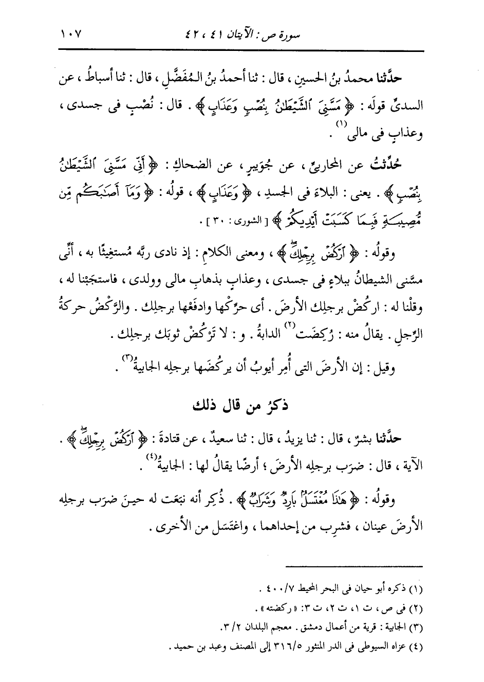 ذِكْرُ مَنْ قَالَ ذَلِكَ: حَدَّثَنَا بِشْرٌ، قَالَ: ثنا يَزِيدُ، قَالَ: ثنا سَعِيدٌ، عَنْ قَتَادَةَ، {§ارْكُضْ بِرِجْلِكَ. . .} [ص: 42] الْآيَةَ، قَالَ: «ضَرَبَ بِرِجْلِهِ الْأَرْضَ، أَرْضًا يُقَالُ لَهَا الْجَابِيَةُ»