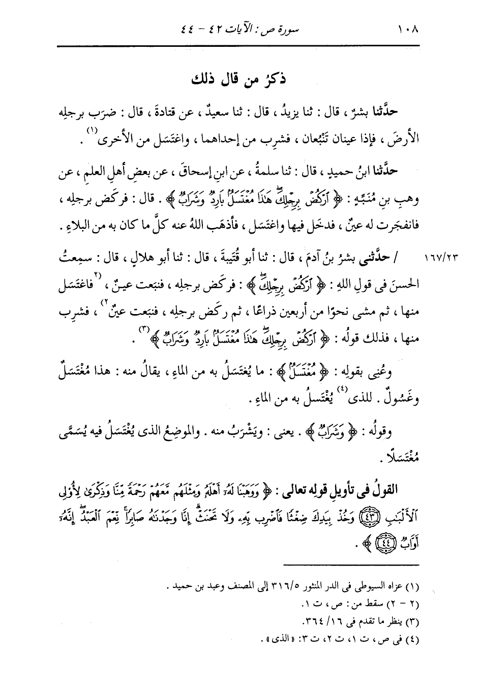 حَدَّثَنَا ابْنُ حُمَيْدٍ، قَالَ: ثنا سَلَمَةُ، عَنِ ابْنِ إِسْحَاقَ، عَنْ بَعْضِ أَهْلِ الْعِلْمِ، عَنْ وَهْبِ بْنِ مُنَبِّهٍ، {§ارْكُضْ بِرِجْلِكَ هَذَا مُغْتَسَلٌ بَارِدٌ وَشَرَابٌ} [ص: 42] قَالَ: «فَرَكَضَ بِرِجْلِهِ، فَانْفَجَرَتْ لَهُ عَيْنٌ، فَدَخَلَ فِيهَا وَاغْتَسَلَ، فَأَذْهَبَ اللَّهُ عَنْهُ كُلَّ مَا كَانَ مِنَ الْبَلَاءِ»