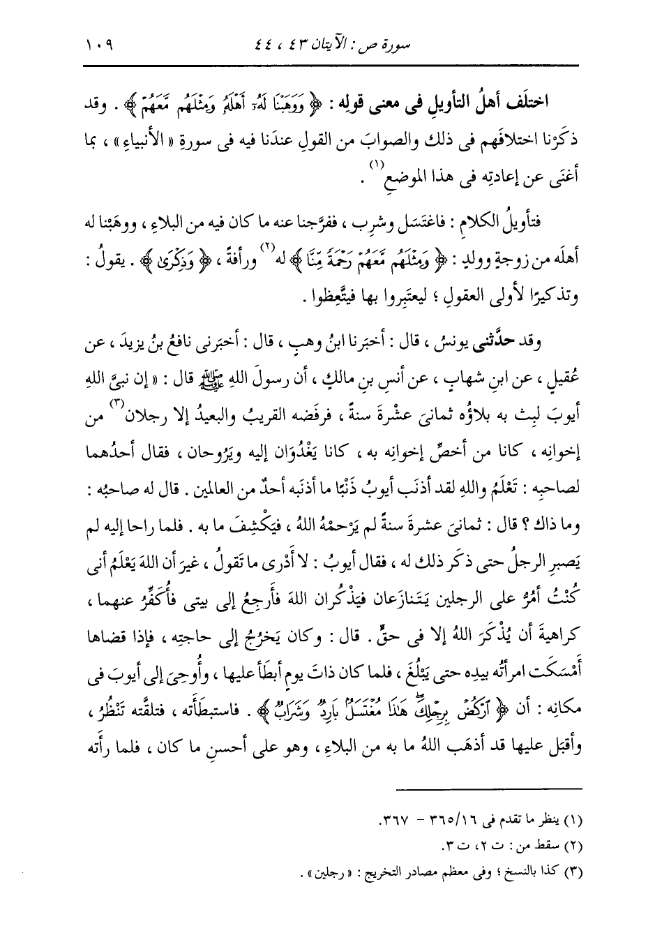 وَقَدْ: حَدَّثَنِي يُونُسُ، قَالَ: أَخْبَرَنَا ابْنُ وَهْبٍ، قَالَ: أَخْبَرَنِي نَافِعُ بْنُ يَزِيدَ، عَنْ عُقَيْلٍ، عَنِ ابْنِ شِهَابٍ، عَنْ أَنَسِ بْنِ مَالِكٍ، أَنَّ رَسُولَ اللَّهِ صَلَّى اللهُ عَلَيْهِ وَسَلَّمَ قَالَ: " §إِنَّ نَبِيَّ اللَّهِ أَيُّوبَ لَبِثَ بِهِ بَلَاؤُهُ ثَمَانِيَ عَشْرَةَ سَنَةً، فَرَفَضَهُ الْقَرِيبُ وَالْبَعِيدُ، إِلَّا رَجُلَانِ مِنْ إِخْوَانِهِ كَانَا مِنْ أَخَصِّ إِخْوَانِهِ بِهِ، كَانَا يَغْدُوَانِ إِلَيْهِ وَيَرُوحَانِ، فَقَالَ أَحَدُهُمَا لِصَاحِبِهِ: تَعْلَمُ وَاللَّهِ لَقَدْ أَذْنَبَ أَيُّوبُ ذَنْبًا مَا أَذْنَبَهُ أَحَدٌ مِنَ الْعَالَمِينَ، قَالَ لَهُ صَاحِبُهُ: وَمَا ذَاكَ؟ قَالَ: مِنْ ثَمَانِيَ عَشْرَةَ سَنَةً لَمْ يَرْحَمْهُ اللَّهُ فَيَكْشَفَ مَا بِهِ؛ فَلَمَّا رَاحَا إِلَيْهِ لَمْ يَصْبِرِ الرَّجُلُ حَتَّى ذَكَرَ ذَلِكَ لَهُ، فَقَالَ أَيُّوبُ: لَا أَدْرِي مَا تَقُولُ، غَيْرَ أَنَّ اللَّهَ يَعْلَمُ أَنِّي كُنْتُ أَمُرُّ عَلَى الرَّجُلَيْنِ يَتَنَازَعَانِ فَيَذْكُرَانِ اللَّهَ، فَأَرْجِعَ إِلَى بَيْتِي فَأُكَفِّرُ عَنْهُمَا كَرَاهِيَةَ أَنْ يُذْكَرَ اللَّهُ إِلَّا فِي حَقٍّ؛ قَالَ: وَكَانَ يَخْرُجُ إِلَى حَاجَتِهِ، فَإِذَا قَضَاهَا أَمْسَكَتِ امْرَأَتُهُ بِيَدِهِ حَتَّى يَبْلُغَ فَلَمَّا كَانَ ذَاتَ يَوْمٍ أَبْطَأَ عَلَيْهَا، وَأُوحِيَ إِلَى أَيُّوبَ فِي مَكَانِهِ: أَنِ {ارْكُضْ بِرِجْلِكَ هَذَا مُغْتَسَلٌ بَارِدٌ وَشَرَابٌ} [ص: 42] فَاسْتَبْطَأَتْهُ، فَتَلَقَّتْهُ تَنْظُرُ، فَأَقْبَلَ عَلَيْهَا قَدْ أَذْهَبَ اللَّهُ مَا بِهِ مِنَ الْبَلَاءِ، وَهُوَ عَلَى أَحْسَنِ مَا كَانَ؛ فَلَمَّا رَأَتْهُ -[110]- قَالَتْ: أَيْ بَارَكَ اللَّهُ فِيكَ، هَلْ رَأَيْتَ نَبِيَّ اللَّهِ هَذَا الْمُبْتَلَى، فَوَاللَّهِ عَلَى ذَلِكَ مَا رَأَيْتُ أَحَدًا أَشْبَهَ بِهِ مِنْكَ إِذْ كَانَ صحِيحًا؟ قَالَ: فَإِنِّي أَنَا هُوَ؛ قَالَ: وَكَانَ لَهُ أَنْدَرَانِ: أَنْدَرٌ لِلْقَمْحِ، وَأَنْدَرٌ لِلشَّعِيرِ، فَبَعَثَ اللَّهُ سَحَابَتَيْنِ، فَلَمَّا كَانَتْ إِحْدَاهُمَا عَلَى أَنْدَرِ الْقَمْحِ، أَفْرَغَتْ فِيهِ الذَّهَبَ حَتَّى فَاضَ، وَأَفْرَغَتِ الْأُخْرَى فِي أَنْدَرِ الشَّعِيرِ الْوَرِقَ حَتَّى فَاضَ "