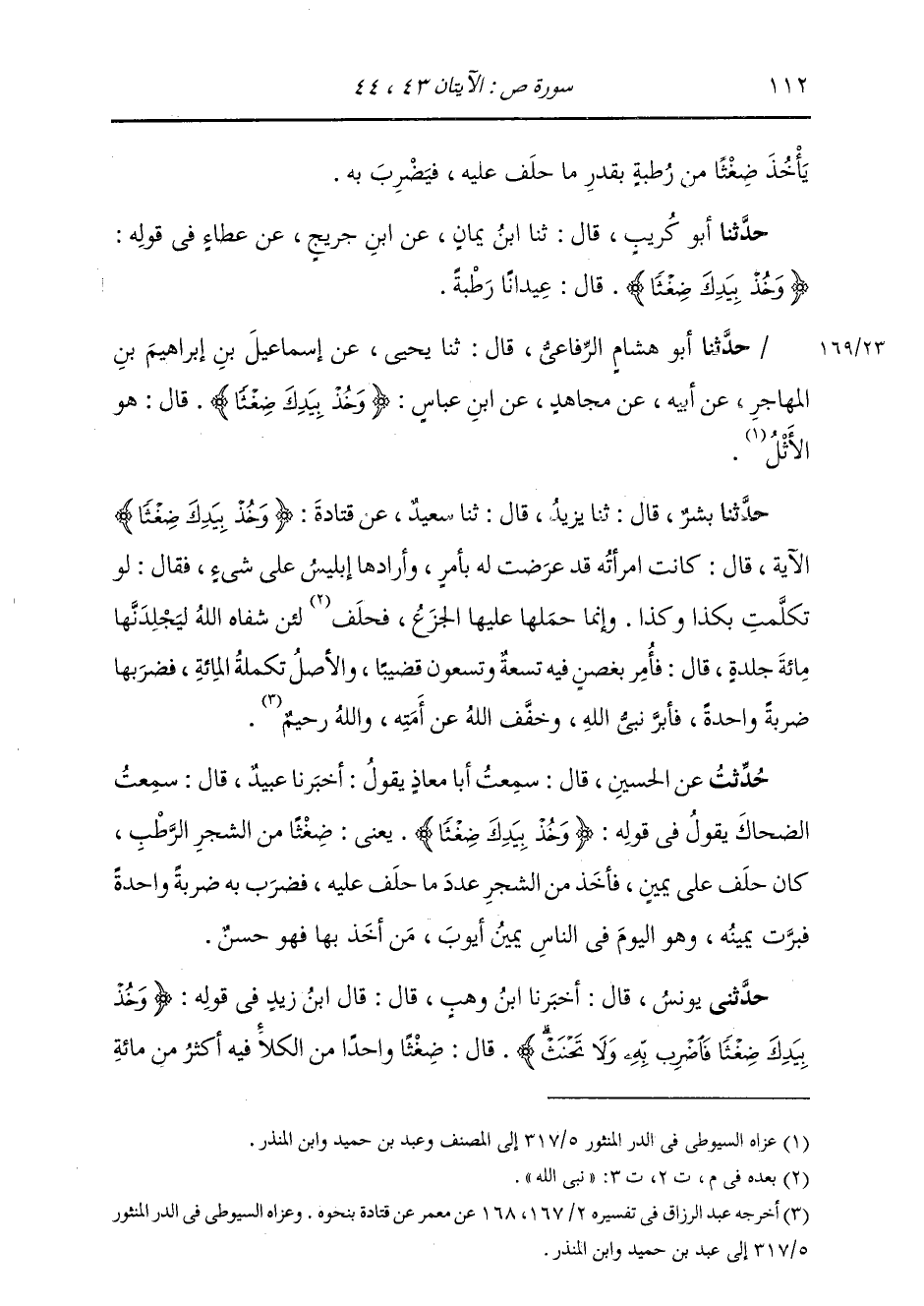 حَدَّثَنِي يُونُسُ، قَالَ: أَخْبَرَنَا ابْنُ وَهْبٍ، قَالَ: قَالَ ابْنُ زَيْدٍ، فِي قَوْلِهِ: {وَخُذْ بِيَدِكَ ضِغْثًا فَاضْرِبْ بِهِ وَلَا تَحْنَثْ} [ص: 44] قَالَ: «§ضِغْثًا وَاحِدًا مِنَ الْكَلَأِ فِيهِ أَكْثَرُ مِنْ مِائَةِ -[113]- عُودٍ، فَضَرَبَ بِهِ ضَرْبَةً وَاحِدَةً، فَذَلِكَ مِائَةُ ضَرْبَةٍ»