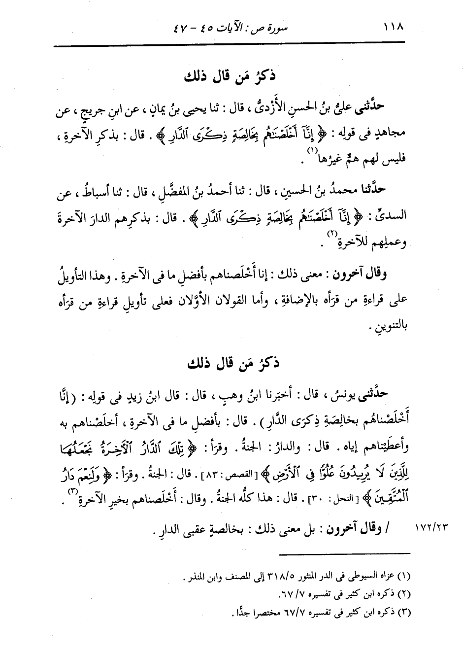 حَدَّثَنَا مُحَمَّدُ بْنُ الْحُسَيْنِ، قَالَ: ثنا أَحْمَدُ بْنُ الْمُفَضَّلِ، قَالَ: ثنا أَسْبَاطٌ، عَنِ السُّدِّيِّ، {§إِنَّا أَخْلَصْنَاهُمْ بِخَالِصَةٍ ذِكْرَى الدَّارِ} [ص: 46] قَالَ: «بِذِكْرِهِمُ الدَّارَ الْآخِرَةَ، وَعَمَلِهِمْ لِلْآخِرَةِ» وَقَالَ آخَرُونَ: مَعْنَى ذَلِكَ: إِنَّا أَخْلَصْنَاهُمْ بِأَفْضَلِ مَا فِي الْآخِرَةِ؛ وَهَذَا التَّأْوِيلُ عَلَى قِرَاءَةِ مَنْ قَرَأَهُ بِالْإِضَافَةِ وَأَمَّا الْقَوْلَانِ الْأَوَّلَانِ فَعَلَى تَأْوِيلِ قِرَاءَةِ مَنْ قَرَأَهُ بِالتَّنْوِينِ