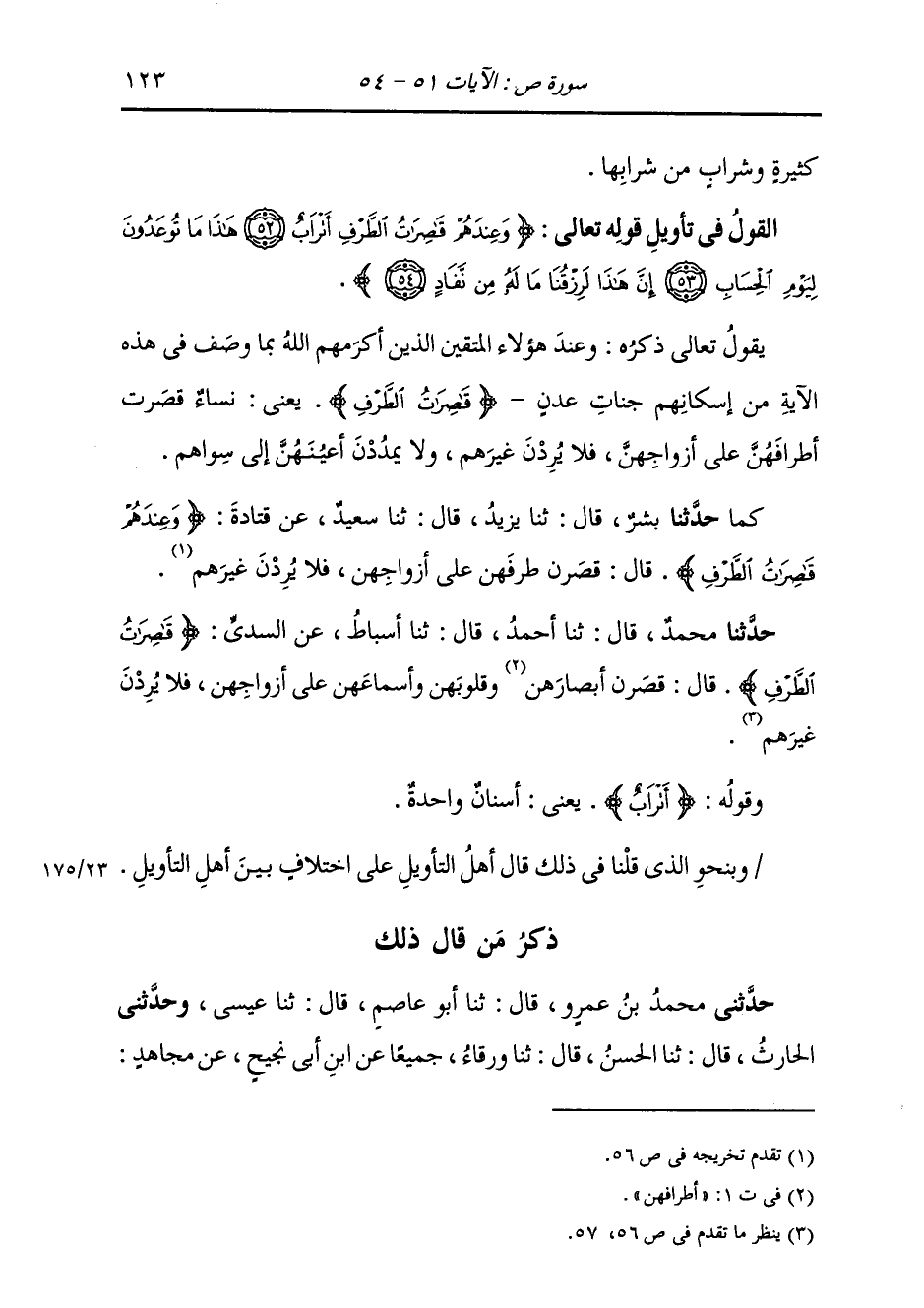 §الْقَوْلُ فِي تَأْوِيلِ قَوْلِهِ تَعَالَى: {وَعِنْدَهُمْ قَاصِرَاتُ الطَّرْفِ أَتْرَابٌ هَذَا مَا تُوعَدُونَ لِيَوْمِ الْحِسَابِ إِنَّ هَذَا لَرِزْقُنَا مَا لَهُ مِنْ نَفَادٍ} [ص: 53] يَقُولُ تَعَالَى ذِكْرُهُ: عِنْدَ هَؤُلَاءِ الْمُتَّقِينَ الَّذِينَ أَكْرَمَهُمُ اللَّهُ بِمَا وَصَفَ فِي هَذِهِ الْآيَةِ مِنْ إِسْكَانِهِمْ جَنَّاتِ عَدْنٍ {قَاصِرَاتُ الطَّرْفِ} [الصافات: 48] يَعْنِي: نِسَاءٌ قُصِرَتْ أَطْرَافُهُنَّ عَلَى أَزْوَاجِهِنَّ، فَلَا يَرِدْنَ غَيْرَهُمْ، وَلَا يَمْدِدْنَ أَعْيُنَهُنَّ إِلَى سِوَاهُمْ