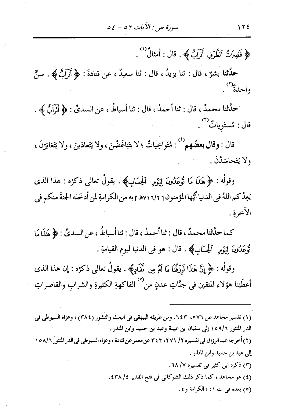 كَمَا: حَدَّثَنَا مُحَمَّدٌ، قَالَ: ثنا أَحْمَدُ، قَالَ: ثنا أَسْبَاطٌ، عَنِ السُّدِّيِّ، {§هَذَا مَا تُوعَدُونَ لِيَوْمِ الْحِسَابِ} [ص: 53] قَالَ: «هُوَ فِي الدُّنْيَا لِيَوْمِ الْقِيَامَةِ»
