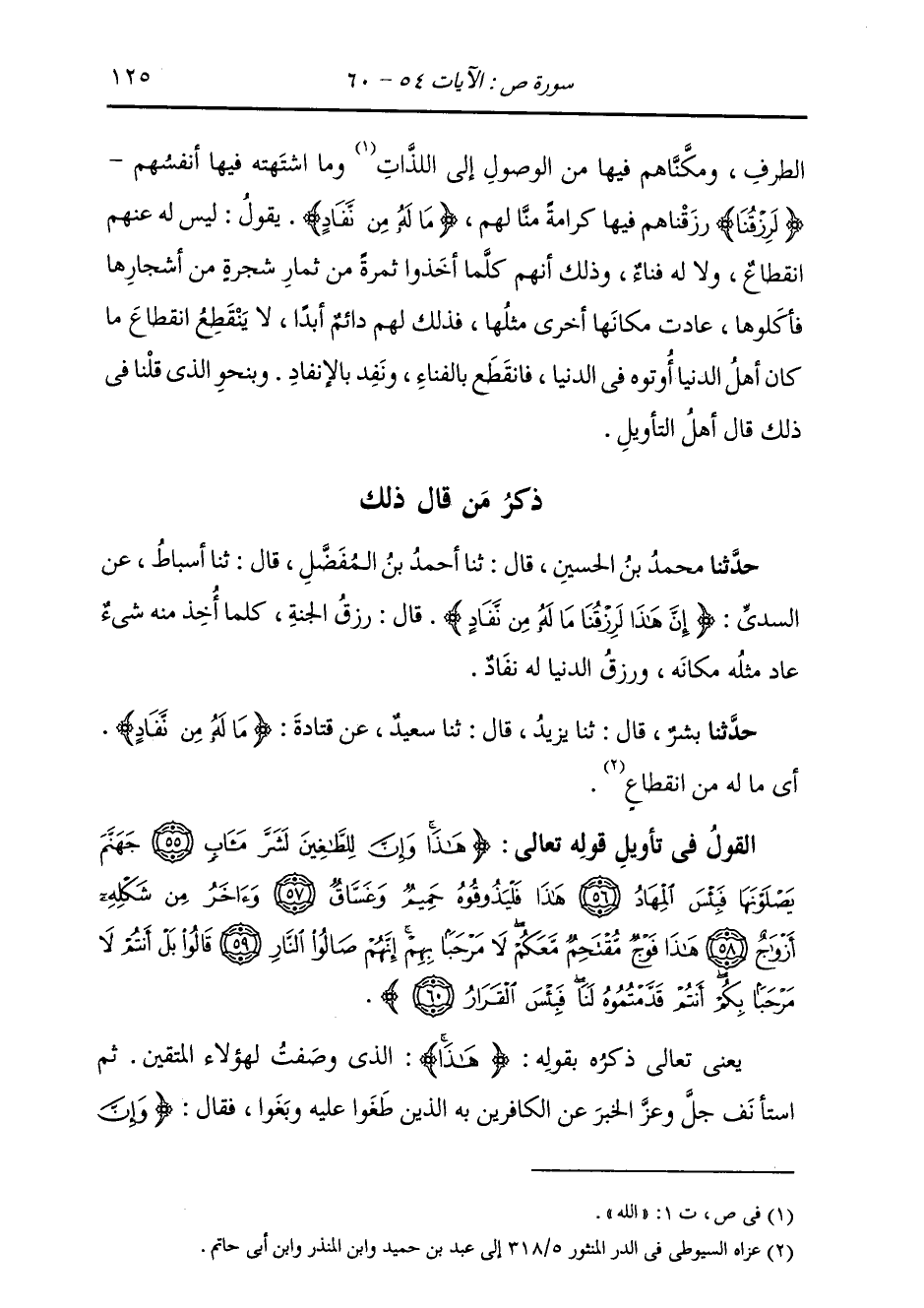 ذِكْرُ مَنْ قَالَ ذَلِكَ: حَدَّثَنَا مُحَمَّدُ بْنُ الْحُسَيْنِ، قَالَ: ثنا أَحْمَدُ بْنُ الْمُفَضَّلِ، قَالَ: ثنا أَسْبَاطٌ، عَنِ السُّدِّيِّ، {§إِنَّ هَذَا لَرِزْقُنَا مَا لَهُ مِنْ نَفَادٍ} [ص: 54] قَالَ: «رِزْقُ الْجَنَّةِ، كُلَّمَا أُخِذَ مِنْهُ شَيْءٌ عَادَ مِثْلُهُ مَكَانَهُ، وَرِزْقُ الدُّنْيَا لَهُ نَفَادٍ»