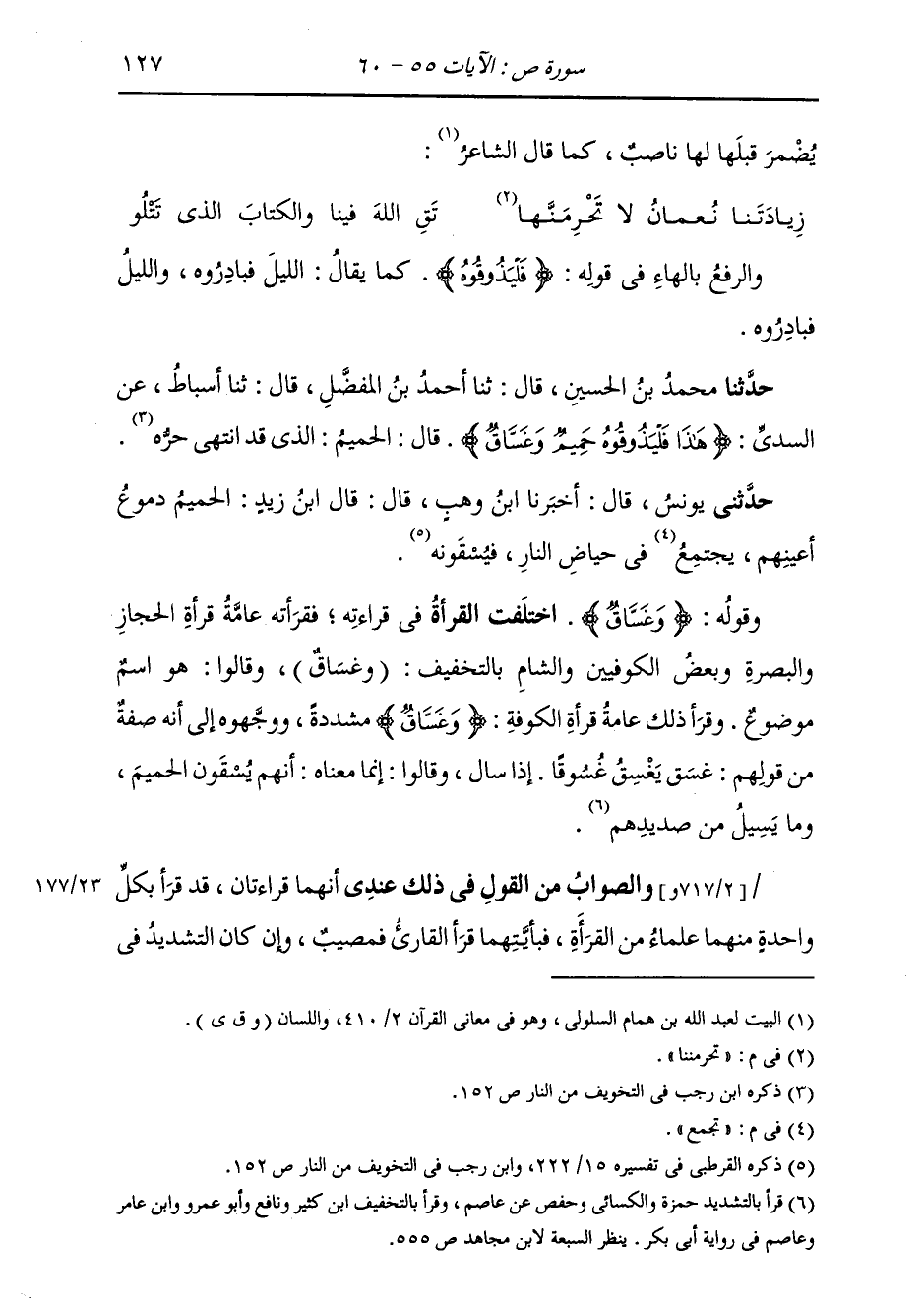 §وَقَوْلُهُ: {وَغَسَّاقٌ} [ص: 57] اخْتَلَفَتِ الْقُرَّاءُ فِي قِرَاءَتِهِ، فَقَرَأَتْهُ عَامَّةُ قُرَّاءِ الْحِجَازِ وَالْبَصْرَةِ وَبَعْضُ الْكُوفِيِّينَ وَالشَّامِ بِالتَّخْفِيفِ: {وَغَسَاقٌ} [ص: 57] وَقَالُوا: هُوَ اسْمٌ مَوْضُوعٌ وَقَرَأَ ذَلِكَ عَامَّةُ قُرَّاءِ الْكُوفَةِ: {وَغَسَّاقٌ} [ص: 57] مُشَدَّدَةً، وَوَجَّهُوهُ إِلَى أَنَّهُ صِفَةٌ مِنْ قَوْلِهِمْ: غَسَقَ يَغْسِقُ غُسُوقًا: إِذَا سَالَ، وَقَالُوا: إِنَّمَا مَعْنَاهُ: أَنَّهُمْ يُسْقَوْنَ الْحَمِيمَ، وَمَا يَسِيلُ مِنْ صَدِيدِهِمْ وَالصَّوَابُ مِنَ الْقَوْلِ فِي ذَلِكَ عِنْدِي أَنَّهُمَا قِرَاءَتَانِ قَدْ قَرَأَ بِكُلِّ وَاحِدَةٍ مِنْهُمَا عُلَمَاءُ مِنَ الْقُرَّاءِ، فَبِأَيَّتِهِمَا قَرَأَ الْقَارِئُ فَمُصِيبٌ، وَإِنْ كَانَ التَّشْدِيدُ فِي -[128]- السِّينِ أَتَمَّ عِنْدَنَا فِي ذَلِكَ، لِأَنَّ الْمَعْرُوفُ ذَلِكَ فِي الْكَلَامِ، وَإِنْ كَانَ الْآخَرُ غَيْرَ مَدْفُوعَةٌ صِحَّتَهُ وَاخْتَلَفَ أَهْلُ التَّأْوِيلِ فِي مَعْنَى ذَلِكَ، فَقَالَ بَعْضُهُمْ: هُوَ مَا يَسِيلُ مِنْ جُلُودِهِمْ مِنَ الصَّدِيدِ وَالدَّمِ