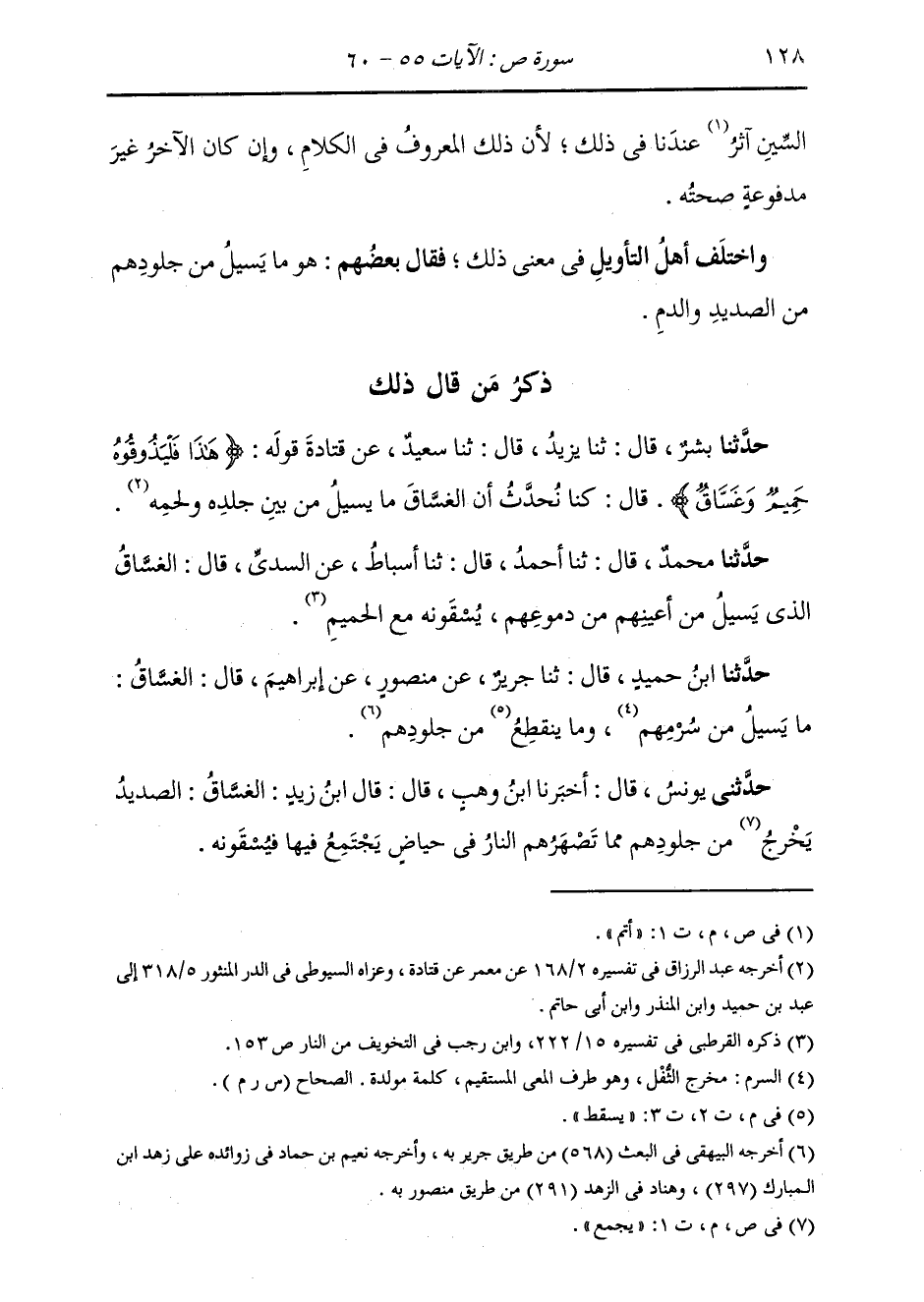 ذِكْرُ مَنْ قَالَ ذَلِكَ: حَدَّثَنَا بِشْرٌ، قَالَ: ثنا يَزِيدُ، قَالَ: ثنا سَعِيدٌ، عَنْ قَتَادَةَ، {§هَذَا فَلْيَذُوقُوهُ حَمِيمٌ وَغَسَّاقٌ} [ص: 57] قَالَ: " كُنَّا نُحَدَّثُ أَنَّ الْغَسَّاقَ: مَا يَسِيلُ مِنْ بَيْنَ جِلْدِهِ وَلَحْمِهِ "