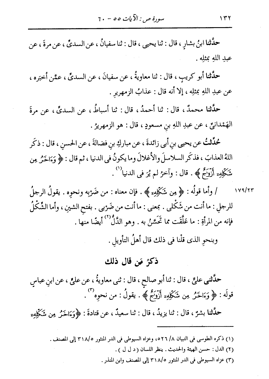 حُدِّثْتُ عَنْ يَحْيَى بْنِ أَبِي زَائِدَةَ، عَنْ مُبَارَكِ بْنِ فَضَالَةَ، عَنِ الْحَسَنِ، قَالَ: " §ذَكَرَ اللَّهُ الْعَذَابَ، فَذَكَرَ السَّلَاسِلَ وَالْأَغْلَالَ، وَمَا يَكُونُ فِي الدُّنْيَا، ثُمَّ قَالَ: {وَآخَرُ مِنْ شَكْلِهِ أَزْوَاجٌ} [ص: 58] قَالَ: وَآخَرُ لَمْ يُرَ فِي الدُّنْيَا " وَأَمَّا قَوْلُهُ: {مِنْ شَكْلِهِ} [ص: 58] فَإِنَّ مَعْنَاهُ: مِنْ ضَرْبِهِ، وَنَحْوُهُ يَقُولُ الرَّجُلُ لِلرَّجُلِ: مَا أَنْتَ مِنْ شَكْلِي، بِمَعْنَى: مَا أَنْتَ مِنْ ضَرْبِي بِفَتْحِ الشِّينِ وَأَمَّا الشِّكْلُ فَإِنَّهُ مِنَ الْمَرْأَةِ مَا عَلَّقَتْ مِمَّا تَتَحَسَّنُ بِهِ، وَهُوَ الدَّلُ أَيْضًا مِنْهَا وَبِنَحْوِ الَّذِي قُلْنَا فِي ذَلِكَ قَالَ أَهْلُ التَّأْوِيلِ ذِكْرُ مَنْ قَالَ ذَلِكَ: حَدَّثَنِي عَلِيٌّ، قَالَ: ثنا أَبُو صَالِحٍ، قَالَ: ثني مُعَاوِيَةُ، عَنْ عَلِيٍّ، عَنِ ابْنِ عَبَّاسٍ، قَوْلُهُ: {وَآخَرُ مِنْ شَكْلِهِ أَزْوَاجٌ} [ص: 58] يَقُولُ: مِنْ نَحْوِهِ حَدَّثَنَا بِشْرٌ، قَالَ: ثنا يَزِيدُ، قَالَ: ثنا سَعِيدٌ، عَنْ قَتَادَةَ، {وَآخَرُ مِنْ شَكْلِهِ -[133]- أَزْوَاجٌ} [ص: 58] مِنْ نَحْوِهِ