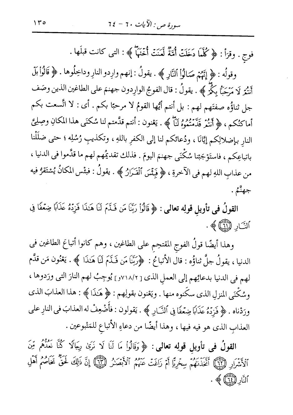 §الْقَوْلُ فِي تَأْوِيلِ قَوْلِهِ تَعَالَى: {قَالُوا رَبَّنَا مَنْ قَدَّمَ لَنَا هَذَا فَزِدْهُ عَذَابًا ضِعْفًا فِي النَّارِ} [ص: 61] وَهَذَا أَيْضًا قَوْلُ الْفَوْجِ الْمُقْتَحِمِ عَلَى الطَّاغِينَ، وَهُمْ كَانُوا أَتْبَاعَ الطَّاغِينَ فِي الدُّنْيَا، يَقُولُ جَلَّ ثَنَاؤُهُ: وَقَالَ الْأَتْبَاعُ: {رَبَّنَا مَنْ قَدَّمَ لَنَا هَذَا} [ص: 61] يَعْنُونَ: مَنْ قَدَّمَ لَهُمْ فِي الدُّنْيَا بِدُعَائِهِمْ إِلَى الْعَمَلِ الَّذِي يُوجِبُ لَهُمُ النَّارَ الَّتِي وَرَدُوهَا، وَسُكْنَى الْمَنْزِلِ الَّذِي سَكَنُوهُ مِنْهَا وَيَعْنُونَ بِقَوْلِهِمْ {هَذَا} [البقرة: 25] الْعَذَابُ الَّذِي وَرَدْنَاهُ {فَزِدْهُ عَذَابًا ضِعْفًا فِي النَّارِ} [ص: 61] يَقُولُونَ: فَأَضْعِفْ لَهُ الْعَذَابَ فِي النَّارِ عَلَى الْعَذَابِ الَّذِي هُوَ فِيهِ فِيهَا، وَهَذَا أَيْضًا مِنْ دُعَاءِ الْأَتْبَاعِ لِلْمَتْبُوعِينَ