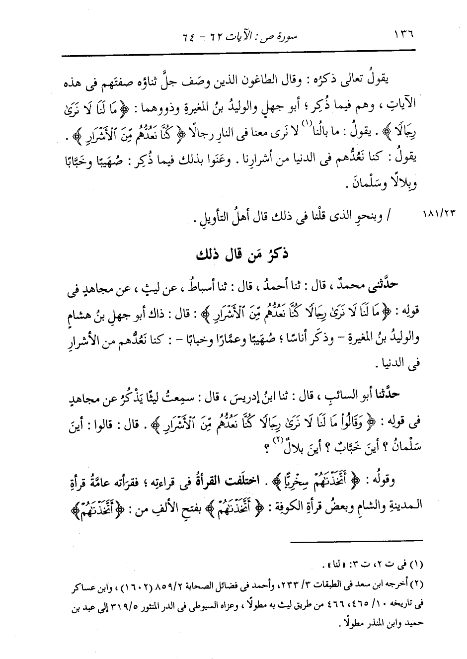 ذِكْرُ مَنْ قَالَ ذَلِكَ: حَدَّثَنِي مُحَمَّدٌ، قَالَ: ثنا أَحْمَدُ، قَالَ: ثنا أَسْبَاطٌ، عَنْ لَيْثٍ، عَنْ مُجَاهِدٍ، فِي قَوْلِهِ: {§مَا لَنَا لَا نَرَى رِجَالًا كُنَّا نَعُدُّهُمْ مِنَ الْأَشْرَارِ} [ص: 62] قَالَ: «ذَاكَ أَبُو جَهْلِ بْنُ هِشَامٍ وَالْوَلِيدُ بْنُ الْمُغِيرَةِ، وَذَكَرَ أُنَاسًا صُهَيْبًا وَعَمَّارًا وَخَبَّابًا، كُنَّا نَعُدُّهُمْ مِنَ الْأَشْرَارِ فِي الدُّنْيَا»