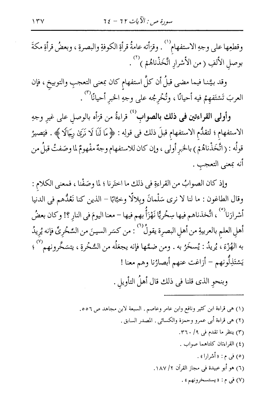 وَقَطْعِهَا عَلَى وَجْهِ الِاسْتِفْهَامِ، وَقَرَأَتْهُ عَامَّةُ قُرَّاءِ الْكُوفَةِ وَالْبَصْرَةِ وَبَعْضُ قُرَّاءِ مَكَّةَ بِوَصْلِ الْأَلِفِ مِنَ الْأَشْرَارِ: (آتَّخَذْنَاهُمْ) وَقَدْ بَيَّنَّا فِيمَا مَضَى قَبْلُ، أَنَّ كُلَّ اسْتِفْهَامٍ كَانَ بِمَعْنَى التَّعَجُّبِ وَالتَّوْبِيخِ فَإِنَّ الْعَرَبَ تَسْتَفْهِمُ فِيهِ أَحْيَانًا، وَتُخْرِجْهُ عَلَى وَجْهِ الْخَبَرِ أَحْيَانًا وَأَوْلَى الْقِرَاءَتَيْنِ فِي ذَلِكَ بِالصَّوَابِ قِرَاءَةُ مَنْ قَرَأَهُ بِالْوَصْلِ عَلَى غَيْرِ وَجْهِ الِاسْتِفْهَامِ، لِتَقَدُّمِ الِاسْتِفْهَامِ قَبْلَ ذَلِكَ فِي قَوْلِهِ: {مَا لَنَا لَا نَرَى رِجَالًا كُنَّا} [ص: 62] فَيَصِيرُ قَوْلُهُ: أَتَّخَذْنَاهُمْ بِالْخَبَرِ أَوْلَى وَإِنْ كَانَ لِلِاسْتِفْهَامِ وَجْهٌ مَفْهُومٌ لِمَا وَصَفْتُ قَبْلُ مِنْ أَنَّهُ بِمَعْنَى التَّعَجُّبِ وَإِذْ كَانَ الصَّوَابُ مِنَ الْقِرَاءَةِ فِي ذَلِكَ مَا اخْتَرْنَا لِمَا وَصَفْنَا، فَمَعْنَى الْكَلَامِ: وَقَالَ الطَّاغُونَ: مَا لَنَا لَا نَرَى سَلْمَانَ وَبِلَالًا وَخَبَّابًا الَّذِينَ كُنَّا نَعُدُّهُمْ فِي الدُّنْيَا أَشْرَارًا، أَتَّخَذْنَاهُمْ فِيهَا سُخْرِيًّا نَهْزَأُ بِهِمْ فِيهَا مَعَنَا الْيَوْمَ فِي النَّارِ؟ وَكَانَ بَعْضُ أَهْلِ الْعِلْمِ بِالْعَرَبِيَّةِ مِنْ أَهْلِ الْبَصْرَةِ يَقُولُ: مَنْ كَسَرَ السِّينَ مِنَ السِّخْرِي، فَإِنَّهُ يُرِيدُ بِهِ الْهُزْءَ، يُرِيدُ يَسْخَرُ بِهِ، وَمَنْ ضَمَّهَا فَإِنَّهُ يَجْعَلُهُ مِنَ السُّخْرَةِ، يَسْتَسْخِرُونَهُمْ: يَسْتَذِلُّونَهُمْ، أَزَاغَتْ عَنْهُمْ أَبْصَارُنَا وَهُمْ مَعَنَا وَبِنَحْوِ الَّذِي قُلْنَا فِي ذَلِكَ قَالَ أَهْلُ التَّأْوِيلِ