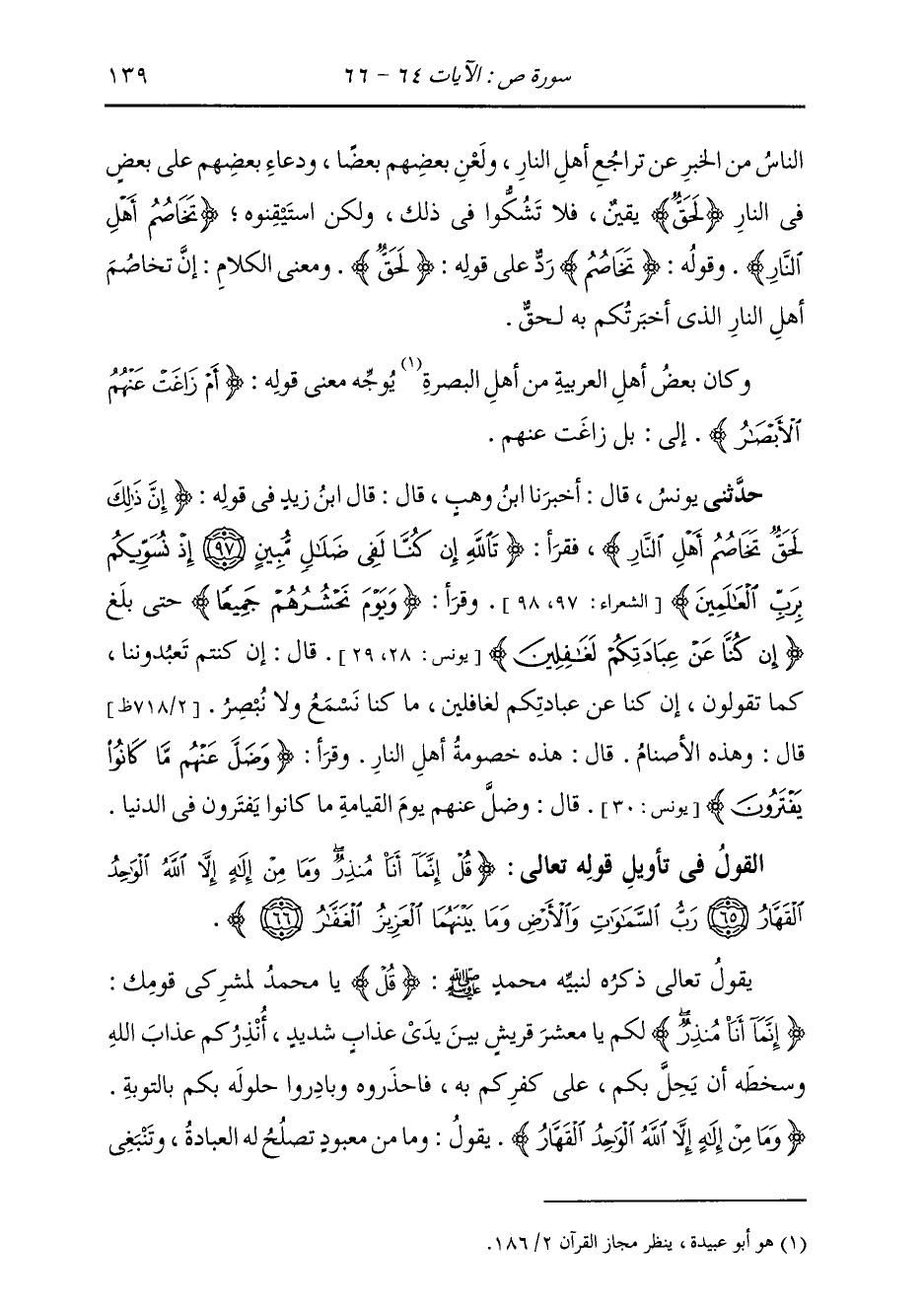 حَدَّثَنِي يُونُسُ، قَالَ: أَخْبَرَنَا ابْنُ وَهْبٍ، قَالَ: قَالَ ابْنُ زَيْدٍ، فِي قَوْلِهِ: {§إِنَّ ذَلِكَ لَحَقٌّ تَخَاصُمُ أَهْلِ النَّارِ} [ص: 64] فَقَرَأَ: {تَاللَّهِ إِنْ كُنَّا لَفِي ضَلَالٍ مُبِينٍ إِذْ نُسَوِّيكُمْ بِرَبِّ الْعَالَمِينَ} [الشعراء: 98] وَقَرَأَ: {يَوْمَ نَحْشُرُهُمْ جَمِيعًا} [الأنعام: 22] حَتَّى بَلَغَ: {إِنْ كُنَّا عَنْ عِبَادَتِكُمْ لَغَافِلِينَ} [يونس: 29] قَالَ: " إِنْ كُنْتُمْ تَعْبُدُونَنَا كَمَا تَقُولُونَ إِنْ كُنَّا عَنْ عِبَادَتِكُمْ لَغَافِلِينَ، مَا كُنَّا نَسْمَعُ وَلَا نُبْصُرُ، قَالَ: وَهَذِهِ الْأَصْنَامُ، قَالَ: هَذِهِ خُصُومَةُ أَهْلِ النَّارِ " وَقَرَأَ: {وَضَلَّ عَنْهُمْ مَا كَانُوا يَفْتَرُونَ} [الأنعام: 24] قَالَ: «وَضَلَّ عَنْهُمْ يَوْمَ الْقِيَامَةِ مَا كَانُوا يَفْتَرُونَ فِي الدُّنْيَا»