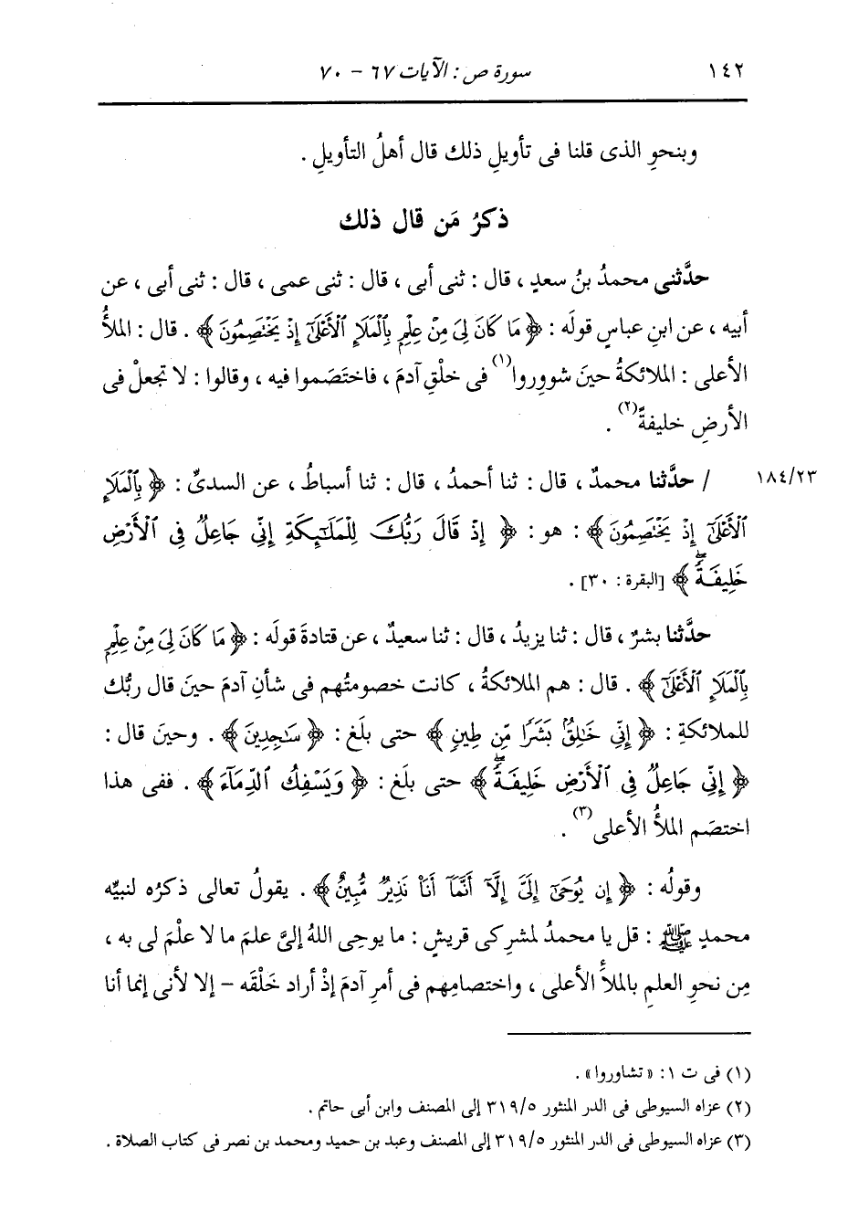 حَدَّثَنَا مُحَمَّدٌ، قَالَ: ثنا أَحْمَدُ، قَالَ: ثنا أَسْبَاطٌ، عَنِ السُّدِّيِّ، {§بِالْمَلَإِ الْأَعْلَى إِذْ يَخْتَصِمُونَ} [ص: 69] " هُوَ: {إِذْ قَالَ رَبُّكَ لِلْمَلَائِكَةِ إِنِّي جَاعِلٌ فِي الْأَرْضِ خَلِيفَةً} [البقرة: 30]