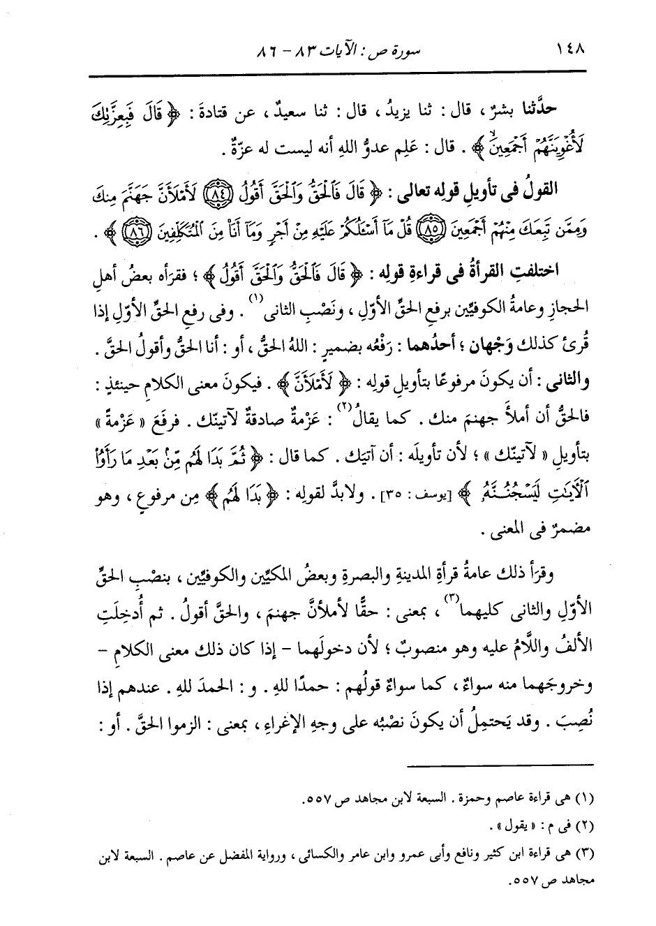 §الْقَوْلُ فِي تَأْوِيلِ قَوْلِهِ تَعَالَى: {قَالَ فَالْحَقُّ وَالْحَقَّ أَقُولُ لَأَمْلَأَنَّ جَهَنَّمَ مِنْكَ وَمِمَّنْ تَبِعَكَ مِنْهُمْ أَجْمَعِينَ قُلْ مَا أَسْأَلُكُمْ عَلَيْهِ مِنْ أَجْرٍ وَمَا أَنَا مِنَ الْمُتَكَلِّفِينَ} [ص: 85] اخْتَلَفَتِ الْقُرَّاءُ فِي قِرَاءَةِ قَوْلِهِ: {قَالَ فَالْحَقُّ وَالْحَقَّ أَقُولُ} [ص: 84] فَقَرَأَهُ بَعْضُ أَهْلِ الْحِجَازِ وَعَامَّةُ الْكُوفِيِّينَ بِرَفْعِ الْحَقِّ الْأَوَّلِ، وَنَصْبِ الثَّانِي وَفِي رَفْعِ الْحَقِّ الْأَوَّلِ إِذَا قُرِئَ كَذَلِكَ وَجْهَانِ: أَحَدُهُمَا رَفْعُهُ بِضَمِيرٍ لِلَّهِ الْحَقُّ، أَوْ أَنَا الْحَقُّ وَأَقُولُ الْحَقَّ وَالثَّانِي: أَنْ يَكُونَ مَرْفُوعًا بِتَأْوِيلِ قَوْلِهِ: {لَأَمْلَأَنَّ} [الأعراف: 18] فَيَكُونُ مَعْنَى الْكَلَامِ حِينَئِذٍ: فَالْحَقُ أَنْ أَمْلَأَ جَهَنَّمَ مِنْكَ، كَمَا يَقُولُ: عَزْمَةٌ صَادِقَةٌ لَآتِيَنَّكَ، فَرَفَعَ عَزْمَةً بِتَأْوِيلِ لَآتِيَنَّكَ، لِأَنَّ تَأْوِيلَهُ أَنْ آتِيَكَ، كَمَا قَالَ: {ثُمَّ بَدَا لَهُمْ مِنْ بَعْدِ مَا رَأَوُا الْآيَاتِ لَيَسْجُنَنَّهُ} [يوسف: 35] فَلَا بُدَّ لِقَوْلِهِ: {بَدَا لَهُمْ} [الأنعام: 28] مِنْ مَرْفُوعٍ، وَهُوَ مُضْمَرٌ فِي الْمَعْنَى وَقَرَأَ ذَلِكَ عَامَّةُ قُرَّاءِ الْمَدِينَةِ وَالْبَصْرَةِ وَبَعْضُ الْمَكِّيِّينَ وَالْكُوفِيِّينَ بِنَصْبِ الْحَقِّ الْأَوَّلِ وَالثَّانِي كِلَيْهِمَا، بِمَعْنَى: حَقًّا لَأَمْلَأَنَّ جَهَنَّمَ وَالْحَقَّ أَقُولُ، ثُمَّ أُدْخِلَتِ الْأَلِفُ وَاللَّامُ عَلَيْهِ، وَهُوَ مَنْصُوبٌ، لِأَنَّ دُخُولَهُمَا إِذَا كَانَ كَذَلِكَ مَعْنَى الْكَلَامِ وَخُرُوجَهُمَا مِنْهُ سَوَاءٌ، كَمَا سَوَاءٌ قَوْلُهُمْ: حَمْدًا لِلَّهِ، وَالْحَمْدَ لِلَّهِ عِنْدَهُمْ إِذَا نَصَبَ وَقَدْ يُحْتَمَلُ أَنْ يَكُونَ نَصَبُهُ عَلَى وَجْهِ الْإِغْرَاءِ بِمَعْنَى: الْزَمُوا الْحَقَّ،
