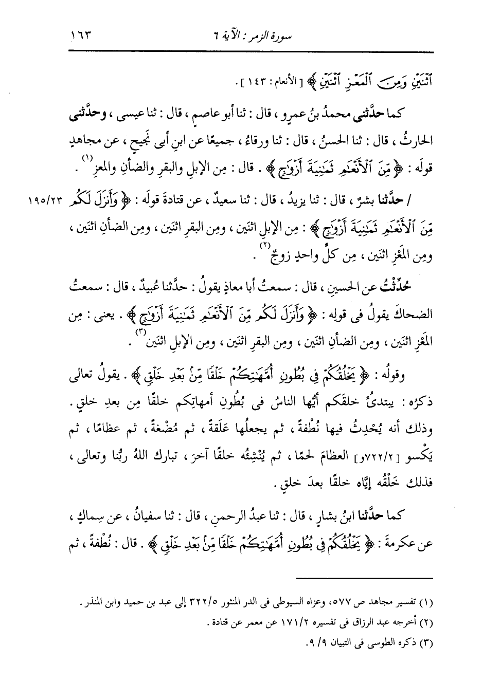 كَمَا: حَدَّثَنِي مُحَمَّدُ بْنُ عَمْرٍو، قَالَ: ثنا أَبُو عَاصِمٍ، قَالَ، ثنا عِيسَى، وَحَدَّثَنِي الْحَارِثُ، قَالَ: ثنا الْحَسَنُ، قَالَ: ثنا وَرْقَاءُ، جَمِيعًا عَنِ ابْنِ أَبِي نَجِيحٍ، عَنْ مُجَاهِدٍ، قَوْلُهُ: {§مِنَ الْأَنْعَامِ ثَمَانِيَةَ أَزْوَاجٍ} [الزمر: 6] قَالَ: «مِنَ الْإِبِلِ وَالْبَقَرِ وَالضَّأْنِ وَالْمَعْزِ»