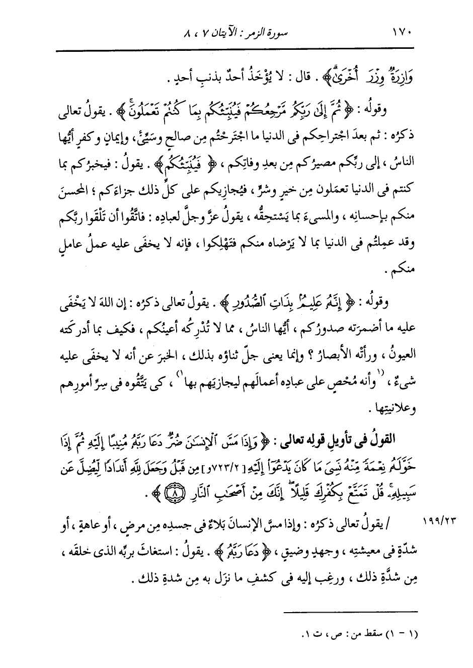 §وَقَوْلُهُ: {ثُمَّ إِلَى رَبِّكُمْ مَرْجِعُكُمْ فَيُنَبِّئُكُمْ بِمَا كُنْتُمْ تَعْمَلُونَ} [الزمر: 7] يَقُولُ تَعَالَى ذِكْرُهُ: ثُمَّ بَعْدَ اجْتِرَاحِكُمْ فِي الدُّنْيَا مَا اجْتَرَحْتُمْ مِنْ صَالِحٍ وَسَيِّئٍ، وَإِيمَانٍ وَكُفْرٍ أَيُّهَا النَّاسُ، إِلَى رَبِّكُمْ مَصِيرُكُمْ مِنْ بَعْدِ وَفَاتِكُمْ، {فَيُنَبِّئُكُمْ} [المائدة: 48] يَقُولُ: فَيُخْبِرُكُمْ بِمَا كُنْتُمْ فِي الدُّنْيَا تَعْمَلُونَهُ مِنْ خَيْرٍ وَشَرٍّ، فَيُجَازِيكُمْ عَلَى كُلِّ ذَلِكَ جَزَاءَكُمْ، الْمُحْسِنُ مِنْكُمْ بِإِحْسَانِهِ، وَالْمُسِيءُ بِمَا يَسْتَحِقَّهُ؛ يَقُولُ عَزَّ وَجَلَّ لِعِبَادِهِ: فَاتَّقُوا أَنْ تَلَقَوْا رَبَّكُمْ وَقَدْ عَمِلْتُمْ فِي الدُّنْيَا بِمَا لَا يَرْضَاهُ مِنْكُمْ فَتَهْلَكُوا، فَإِنَّهُ لَا يَخْفَى عَلَيْهِ عَمَلُ عَامَلٍ مِنْكُمْ