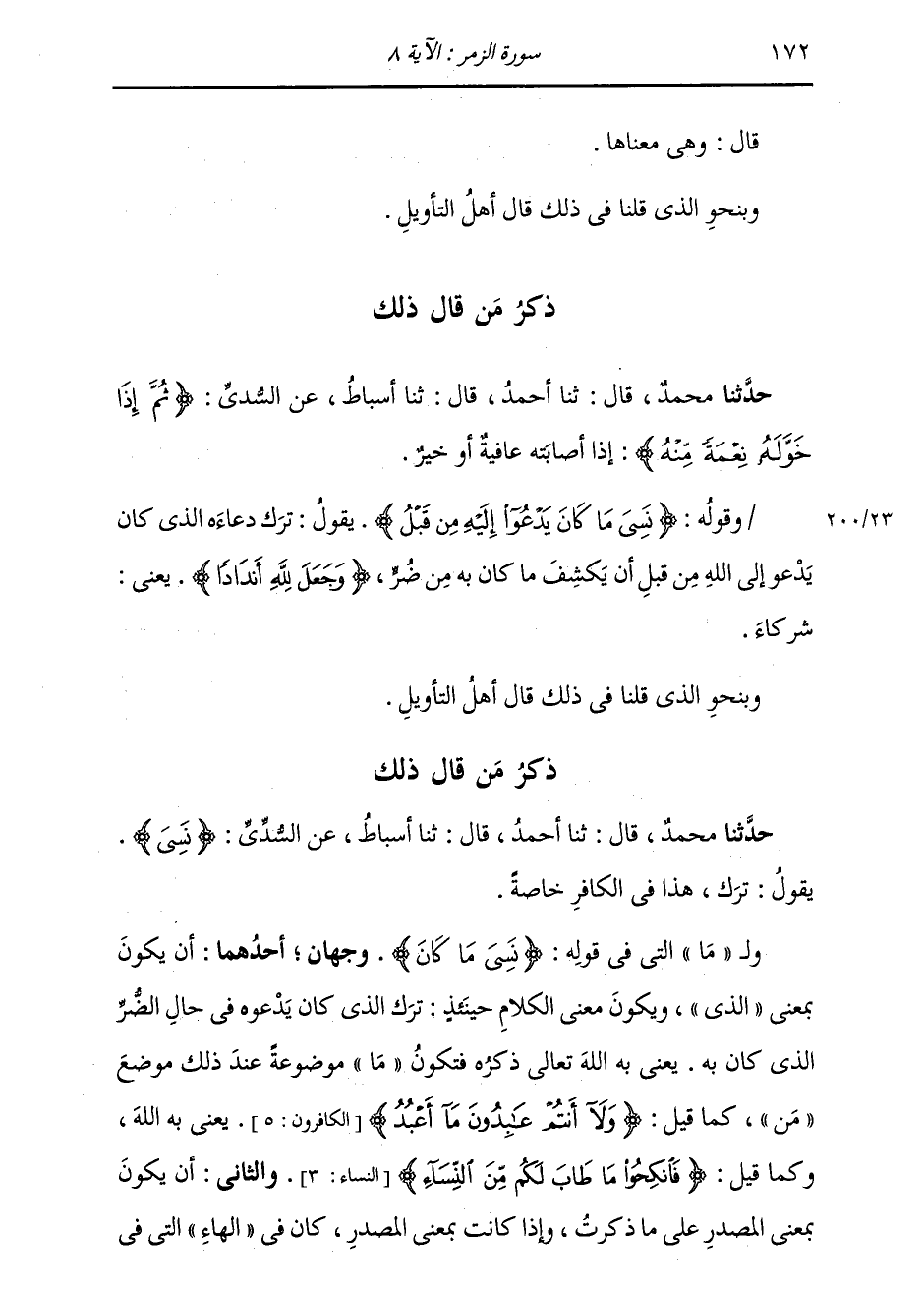 ذِكْرُ مَنْ قَالَ ذَلِكَ: حَدَّثَنَا مُحَمَّدٌ، قَالَ: ثنا أَحْمَدُ، قَالَ: ثنا أَسْبَاطٌ، عَنِ السُّدِّيِّ، {§نَسِيَ} [الزمر: 8] يَقُولُ: «تَرَكَ، هَذَا فِي الْكَافِرِ خَاصَّةً» وَلِ «مَا» الَّتِي فِي قَوْلِهِ: {نَسِيَ مَا كَانَ} [الزمر: 8] وَجْهَانِ: أَحَدُهُمَا: أَنْ يَكُونَ بِمَعْنَى الَّذِي، وَيَكُونُ مَعْنَى الْكَلَامِ حِينَئِذٍ: تَرَكَ الَّذِي كَانَ يَدْعُوهُ فِي حَالِ الضُّرِّ الَّذِي كَانَ بِهِ، يَعْنِي بِهِ اللَّهَ تَعَالَى ذِكْرُهُ، فَتَكُونُ «مَا» مَوْضُوعَةً عِنْدَ ذَلِكَ مَوْضِعَ «مِنْ» كَمَا قِيلَ: {وَلَا أَنْتُمْ عَابِدُونَ مَا أَعْبُدُ} [الكافرون: 3] يَعْنِي بِهِ اللَّهَ، وَكَمَا قِيلَ: {فَانْكِحُوا مَا طَابَ لَكُمْ مِنَ النِّسَاءِ} [النساء: 3] وَالثَّانِي: أَنْ يَكُونَ بِمَعْنَى الْمَصْدَرِ عَلَى مَا ذَكَرْتُ وَإِذَا كَانَتْ بِمَعْنَى الْمَصْدَرِ، كَانَ فِي الْهَاءِ الَّتِي فِي -[173]- قَوْلِهِ: {إِلَيْهِ} [الزمر: 8] وَجْهَانِ: أَحَدُهُمَا: أَنْ يَكُونَ مِنْ ذِكْرِ مَا وَالْآخَرُ: مِنْ ذِكْرِ الرَّبِّ