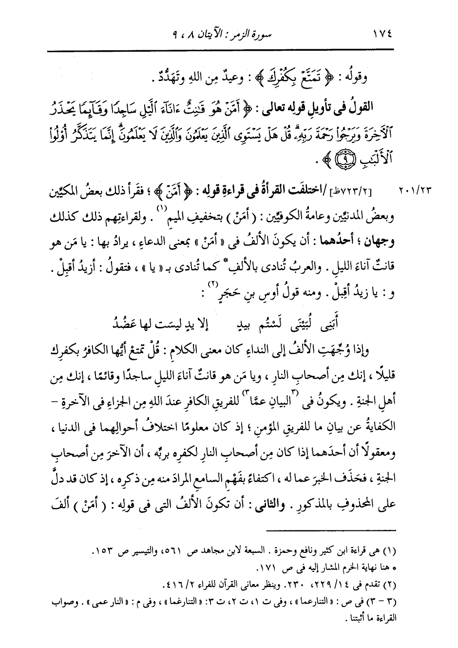 §الْقَوْلُ فِي تَأْوِيلِ قَوْلِهِ تَعَالَى: {أَمَّنْ هُوَ قَانِتٌ آنَاءَ اللَّيْلِ سَاجِدًا وَقَائِمًا يَحْذَرُ الْآخِرَةَ وَيَرْجُو رَحْمَةَ رَبِّهِ قُلْ هَلْ يَسْتَوِي الَّذِينَ يَعْلَمُونَ وَالَّذِينَ لَا يَعْلَمُونَ إِنَّمَا يَتَذَكَّرُ أُولُو الْأَلْبَابِ} اخْتَلَفَتِ الْقُرَّاءُ فِي قِرَاءَةِ قَوْلِهِ: {أَمَّنْ} [البقرة: 283] فَقَرَأَ ذَلِكَ بَعْضُ الْمَكِّيِّينَ وَبَعْضُ الْمَدَنِيِّينَ وَعَامَّةُ الْكُوفِيِّينَ: (أَمَنْ) بِتَخْفِيفِ الْمِيمِ؛ وَلِقِرَاءَتُهُمْ ذَلِكَ كَذَلِكَ وَجْهَانِ: أَحَدُهُمَا: أَنْ يَكُونَ الْأَلِفُ فِي «أَمَّنْ» بِمَعْنَى الدُّعَاءِ، يُرَادُ بِهَا: يَا مَنْ هُوَ قَانِتٌ آنَاءَ اللَّيْلِ، وَالْعَرَبُ تُنَادِي بِالْأَلِفِ كَمَا تُنَادِي بِيَا، فَتَقُولُ: أَزِيدُ أَقْبِلْ، وَيَا زَيْدُ أَقْبِلْ؛ وَمِنْهُ قَوْلُ أَوْسِ بْنِ حَجَرٍ: