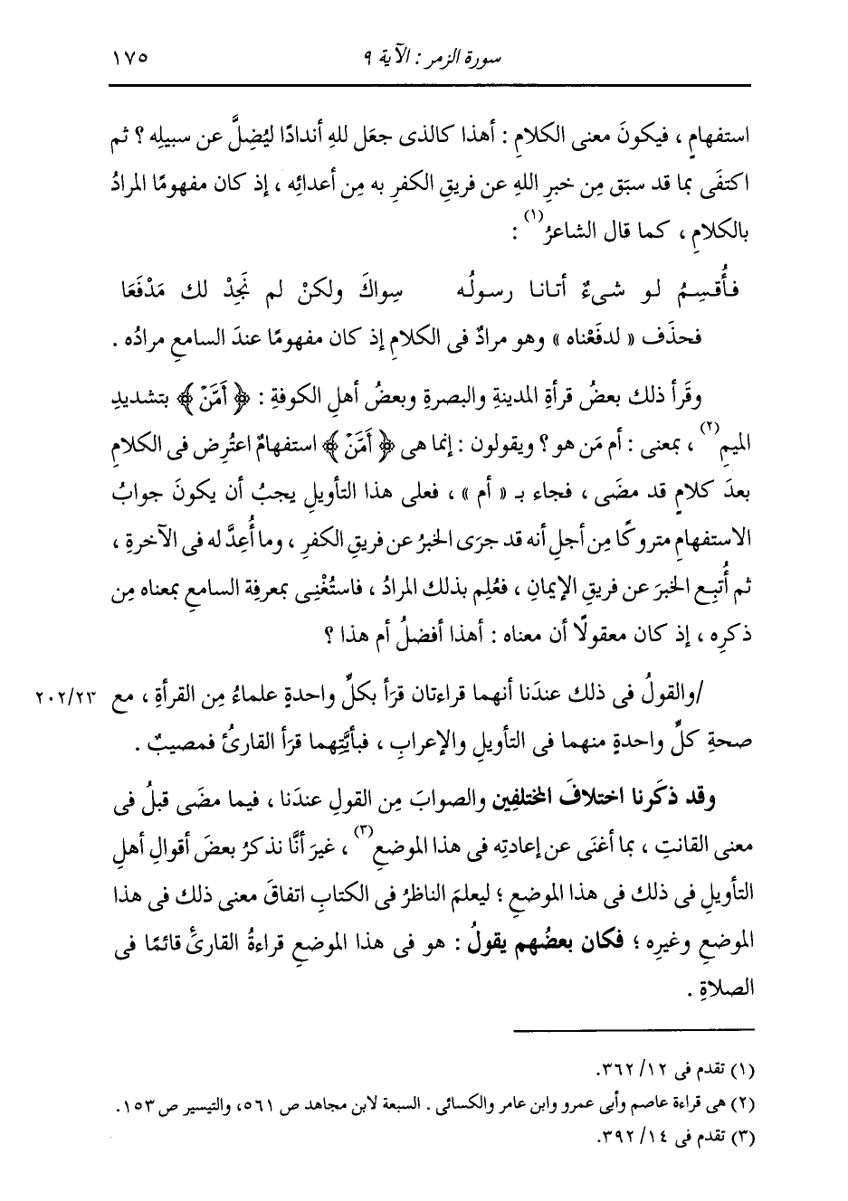فَحُذِفَ لَدَفَعْنَاهُ وَهُوَ مُرَادٌ فِي الْكَلَامِ إِذْ كَانَ مَفْهُومًا عِنْدَ السَّامِعِ مُرَادُهُ وَقَرَأَ ذَلِكَ بَعْضُ قُرَّاءِ الْمَدِينَةِ وَالْبَصْرَةِ وَبَعْضُ أَهْلِ الْكُوفَةِ: {أَمَّنْ} [البقرة: 283] بِتَشْدِيدِ الْمِيمِ، بِمَعْنَى: أَمْ مَنْ هُوَ؟ وَيَقُولُونَ: إِنَّمَا هِيَ {أَمَّنْ} [البقرة: 283] اسْتِفْهَامٌ اعْتَرَضَ فِي الْكَلَامِ بَعْدَ كَلَامٍ قَدْ مَضَى، فَجَاءَ بِأَمْ؛ فَعَلَى هَذَا التَّأْوِيلِ يَجِبُ أَنْ يَكُونَ جَوَابُ الِاسْتِفْهَامِ مَتْرُوكًا مِنْ أَجْلِ أَنَّهُ قَدْ جَرَى الْخَبَرُ عَنْ فَرِيقِ الْكُفْرِ، وَمَا أُعِدَّ لَهُ فِي الْآخِرَةِ، ثُمَّ أُتْبِعَ الْخَبَرُ عَنْ فَرِيقِ الْإِيمَانِ، فَعُلِمَ بِذَلِكَ الْمُرَادُ، فَاسْتَغْنَى بِمِعْرِفَةِ السَّامِعِ بِمَعْنَاهُ مِنْ ذَكَرِهِ، إِذْ كَانَ مَعْقُولًا أَنَّ مَعْنَاهُ: هَذَا أَفْضَلُ أَمْ هَذَا؟ وَالْقَوْلُ فِي ذَلِكَ عِنْدَنَا أَنَّهُمَا قِرَاءَتَانِ قَرَأَ بِكُلِّ وَاحِدَةٍ عُلَمَاءُ مِنَ الْقُرَّاءِ مَعَ صِحَّةِ كُلِّ وَاحِدَةٍ مِنْهُمَا فِي التَّأْوِيلِ وَالْإِعْرَابِ، فَبِأَيَّتِهِمَا قَرَأَ الْقَارِئُ فَمُصِيبٌ وَقَدْ ذَكَرْنَا اخْتِلَافَ الْمُخْتَلِفِينَ، وَالصَّوَابُ مِنَ الْقَوْلِ عِنْدَنَا فِيمَا مَضَى قَبْلَ فِي مَعْنَى الْقَانِتِ، بِمَا أَغْنَى عَنْ إِعَادَتِهِ فِي هَذَا الْمَوْضِعِ؛ غَيْرَ أَنَا نَذْكُرُ بَعْضَ أَقْوَالِ أَهْلِ التَّأْوِيلِ فِي ذَلِكَ فِي هَذَا الْمَوْضِعِ، لِيَعْلَمَ النَّاظِرُ فِي الْكِتَابِ اتِّفَاقَ مَعْنَى ذَلِكَ فِي هَذَا الْمَوْضِعِ وَغَيْرِهِ، فَكَانَ بَعْضُهُمْ يَقُولُ: هُوَ فِي هَذَا الْمَوْضِعِ قِرَاءَةُ الْقَارِئِ قَائِمًا فِي الصَّلَاةِ