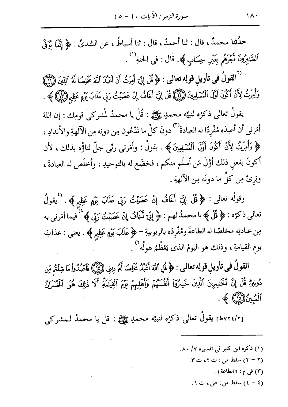 §الْقَوْلُ فِي تَأْوِيلِ قَوْلِهِ تَعَالَى: {قُلْ إِنِّي أُمِرْتُ أَنْ أَعْبُدَ اللَّهَ مُخْلِصَا لَهُ الدِّينَ وَأُمِرْتُ لِأَنْ أَكُونَ أَوَّلَ الْمُسْلِمِينَ قُلْ إِنِّي أَخَافُ إِنْ عَصَيْتُ رَبِّي عَذَابَ يَوْمٍ عَظِيمٍ} [الزمر: 12] يَقُولُ تَعَالَى ذِكْرُهُ لِنَبِيِّهِ مُحَمَّدٍ صَلَّى اللهُ عَلَيْهِ وَسَلَّمَ: قُلْ يَا مُحَمَّدُ لِمُشْرِكِي قَوْمِكَ: إِنَّ اللَّهَ أَمَرَنِي أَنْ أَعْبُدَهُ مُفْرِدًا لَهُ الطَّاعَةَ، دُونَ كُلِّ مَا تَدْعُونَ مِنْ دُونِهِ مِنَ الْآلِهَةِ وَالْأَنْدَادِ {وَأُمِرْتُ لِأَنْ أَكُونَ أَوَّلَ الْمُسْلِمِينَ} [الزمر: 12] : يَقُولُ: وَأَمَرَنِي رَبِّي جَلَّ ثَنَاؤُهُ بِذَلِكَ، لِأَنْ أَكُونَ بِفِعْلِ ذَلِكَ أَوَّلَ مَنْ أَسْلَمَ مِنْكُمْ، فَخَضَعَ لَهُ بِالتَّوْحِيدِ، وَأَخْلَصَ لَهُ الْعِبَادَةَ، وَبَرِئَ مِنْ كُلِّ مَا دُونَهُ مِنَ الْآلِهَةِ