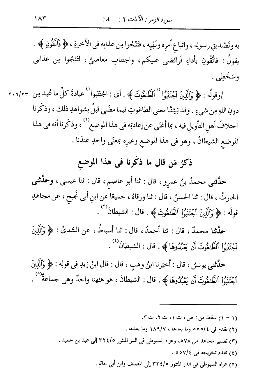 حَدَّثَنَا مُحَمَّدٌ، قَالَ: ثنا أَحْمَدُ، قَالَ: ثنا أَسْبَاطٌ، عَنِ السُّدِّيِّ {§وَالَّذِينَ اجْتَنَبُوا الطَّاغُوتَ أَنْ يَعْبُدُوهَا} [الزمر: 17] قَالَ: «الشَّيْطَانُ»
