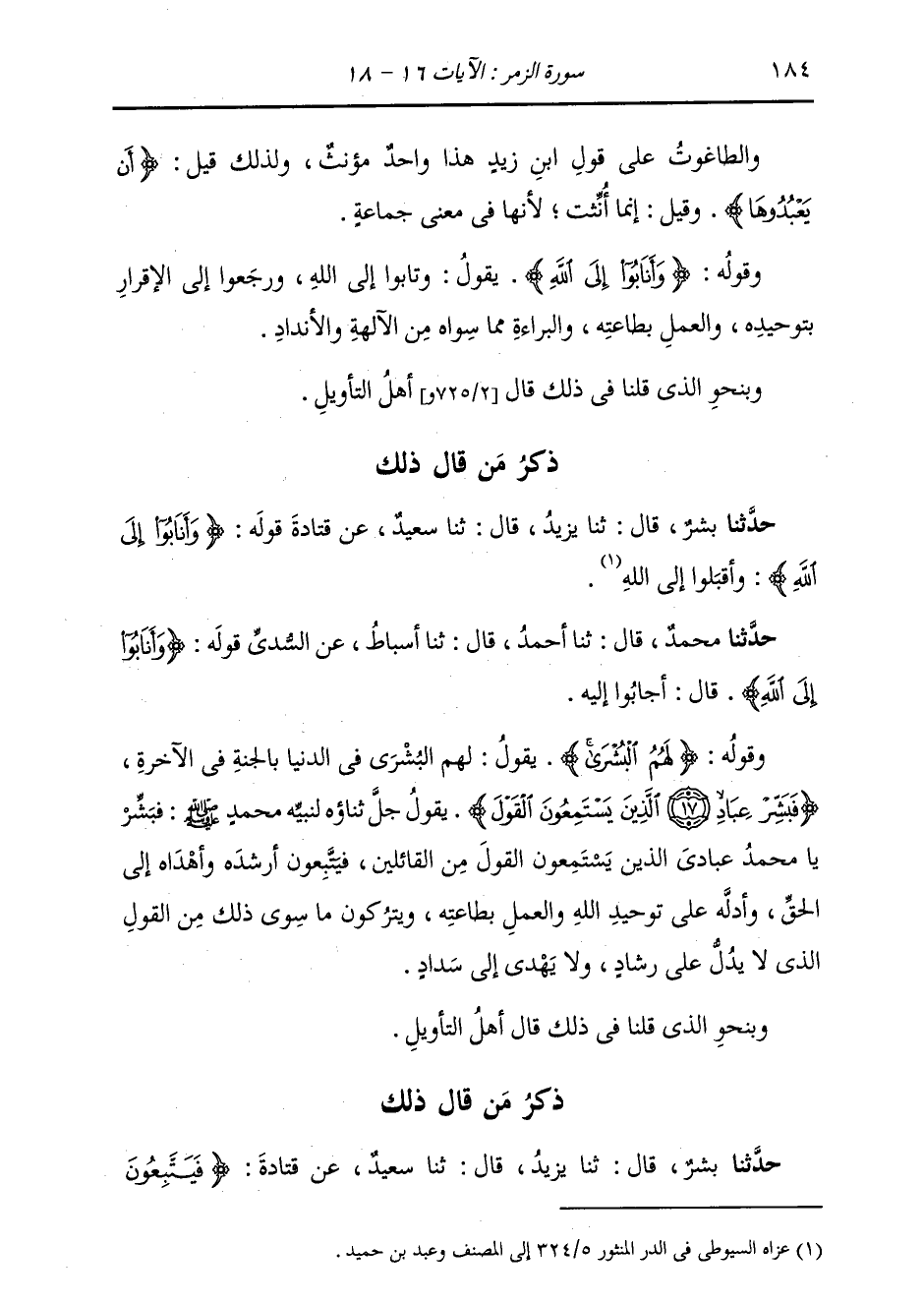 ذِكْرُ مَنْ قَالَ ذَلِكَ: حَدَّثَنَا بِشْرٌ، قَالَ: ثنا يَزِيدُ، قَالَ: ثنا سَعِيدٌ، عَنْ قَتَادَةَ، قَوْلُهُ: {§وَأَنَابُوا إِلَى اللَّهِ} [الزمر: 17] : «وَأَقْبَلُوا إِلَى اللَّهِ»