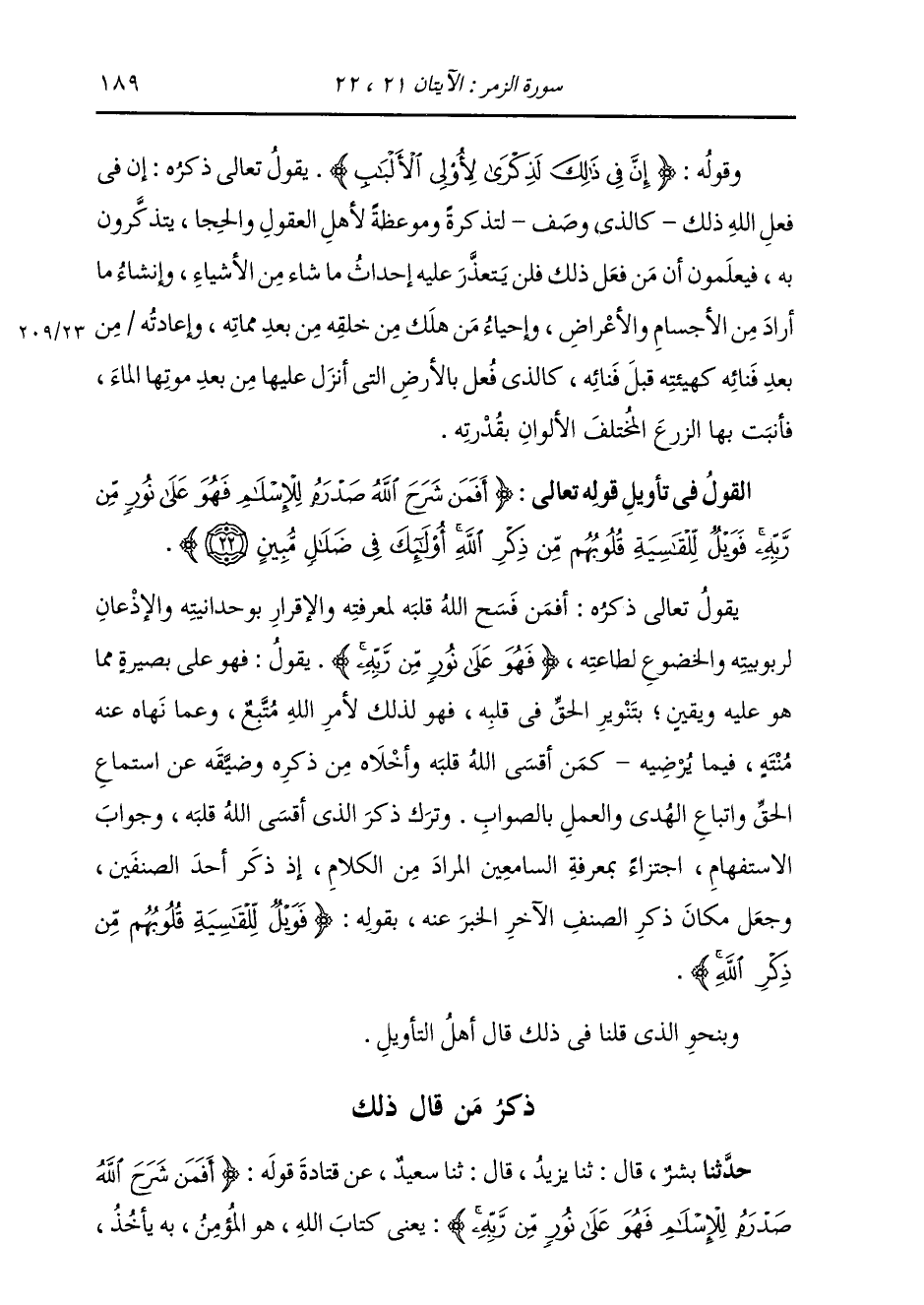 ذِكْرُ مَنْ قَالَ ذَلِكَ: حَدَّثَنَا بِشْرٌ، قَالَ: ثنا يَزِيدُ، قَالَ: ثنا سَعِيدٌ، عَنْ قَتَادَةَ، قَوْلُهُ: {§أَفَمَنْ شَرَحَ اللَّهُ صَدْرَهُ لِلْإِسْلَامِ فَهُوَ عَلَى نُورٍ مِنْ رَبِّهِ} [الزمر: 22] " يَعْنِي: كِتَابَ اللَّهِ، هُوَ الْمُؤْمِنُ بِهِ يَأْخُذُ، -[190]- وَإِلَيْهِ يَنْتَهِي "