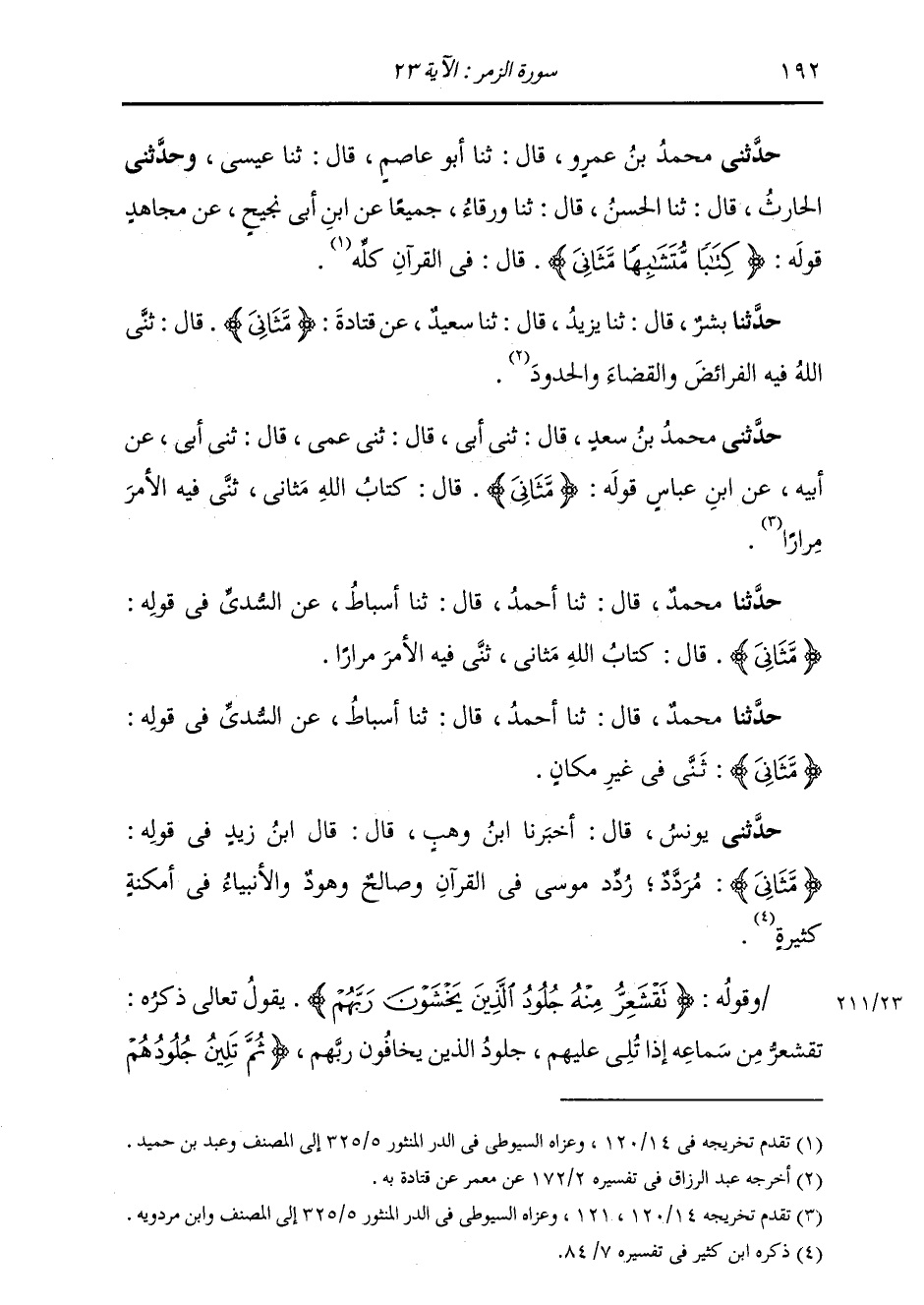 حَدَّثَنِي مُحَمَّدُ بْنُ عَمْرٍو، قَالَ: ثنا أَبُو عَاصِمٍ، قَالَ: ثنا عِيسَى، وَحَدَّثَنِي الْحَارِثُ، قَالَ: ثنا الْحَسَنُ، قَالَ: ثنا وَرْقَاءُ، جَمِيعًا عَنِ ابْنِ أَبِي نَجِيحٍ، عَنْ مُجَاهِدٍ، قَوْلُهُ: {§كِتَابًا مُتَشَابِهًا مَثَانِيَ} [الزمر: 23] قَالَ: «فِي الْقُرْآنِ كُلِّهِ»