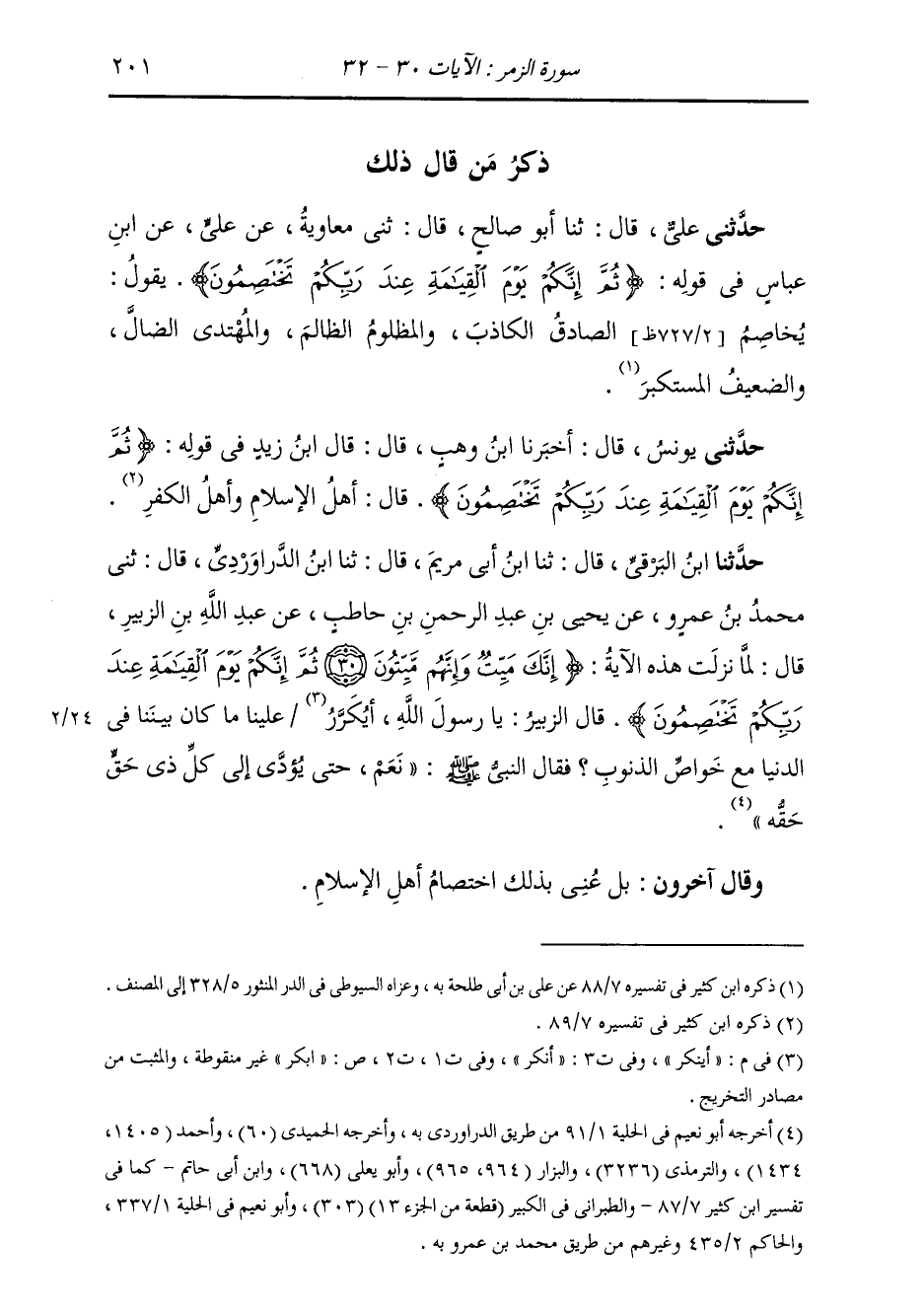 حَدَّثَنِي ابْنُ الْبَرْقِيِّ، قَالَ: ثنا ابْنُ أَبِي مَرْيَمَ، قَالَ: ثنا ابْنُ الدَّرَاوَرْدِيِّ، قَالَ: ثني مُحَمَّدُ بْنُ عَمْرٍو عَنْ يَحْيَى بْنِ عَبْدِ الرَّحْمَنِ بْنِ حَاطِبِ بْنِ الزُّبَيْرِ، قَالَ: لَمَّا نَزَلَتْ هَذِهِ الْآيَةُ: {§إِنَّكَ مَيِّتٌ وَإِنَّهُمْ مَيِّتُونَ ثُمَّ إِنَّكُمْ يَوْمَ الْقِيَامَةِ عِنْدَ رَبِّكُمْ تَخْتَصِمُونَ} [الزمر: 31] قَالَ الزُّبَيْرُ: يَا رَسُولَ اللَّهِ، أَيُنْكِرُ عَلَيْنَا مَا كَانَ بَيْنَنَا فِي الدُّنْيَا مَعَ خَوَاصِّ الذُّنُوبِ؟ فَقَالَ النَّبِيُّ صَلَّى اللهُ عَلَيْهِ وَسَلَّمَ: «نَعَمْ حَتَّى يُؤَدِّي إِلَى كُلِّ ذِي حَقٍّ حَقَّهُ» وَقَالَ آخَرُونَ: بَلْ عُنِيَ بِذَلِكَ اخْتِصَامُ أَهْلِ الْإِسْلَامِ