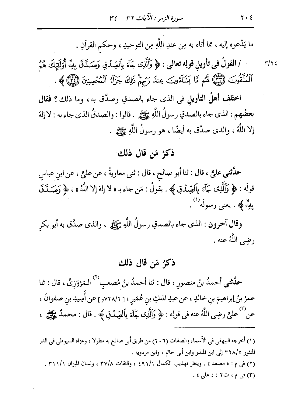 §الْقَوْلُ فِي تَأْوِيلِ قَوْلِهِ تَعَالَى: {وَالَّذِي جَاءَ بِالصِّدْقِ وَصَدَّقَ بِهِ أُولَئِكَ هُمُ الْمُتَّقُونَ لَهُمْ مَا يَشَاءُونَ عِنْدَ رَبِّهِمْ ذَلِكَ جَزَاءُ الْمُحْسِنِينَ} [الزمر: 34] اخْتَلَفَ أَهْلُ التَّأْوِيلِ فِي الَّذِي جَاءَ بِالصِّدْقِ وَصَدَّقَ بِهِ، وَمَا ذَلِكَ، فَقَالَ بَعْضُهُمُ: الَّذِي جَاءَ بِالصِّدْقِ رَسُولُ اللَّهِ صَلَّى اللهُ عَلَيْهِ وَسَلَّمَ قَالُوا: وَالصِّدْقُ الَّذِي جَاءَ بِهِ: لَا إِلَهَ إِلَّا اللَّهُ، وَالَّذِي صَدَّقَ بِهِ أَيْضًا، هُوَ رَسُولُ اللَّهِ صَلَّى اللهُ عَلَيْهِ وَسَلَّمَ