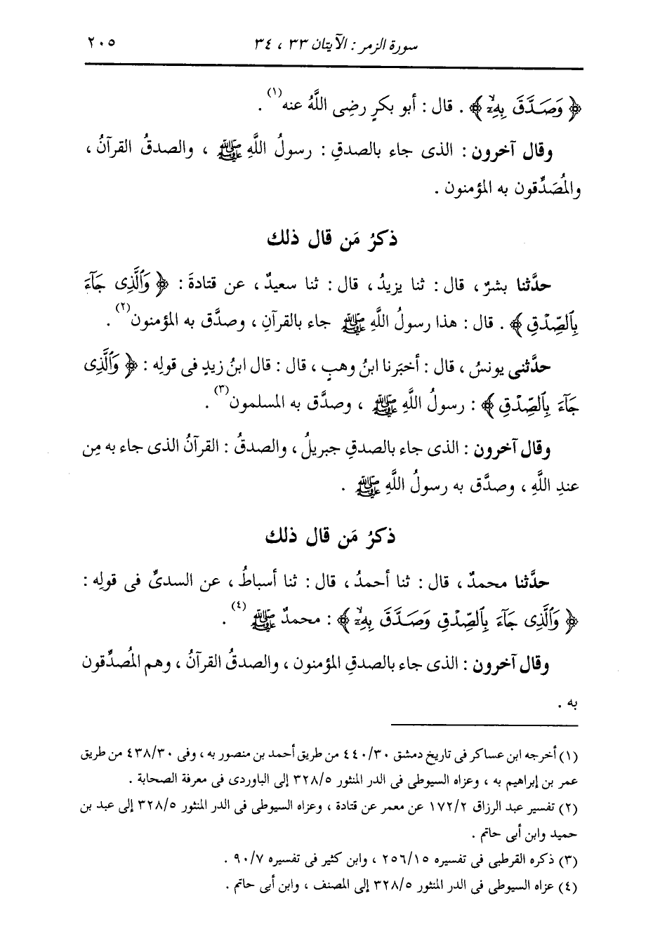 ذِكْرُ مَنْ قَالَ ذَلِكَ: حَدَّثَنَا مُحَمَّدٌ، قَالَ: ثنا أَحْمَدُ، قَالَ: ثنا أَسْبَاطٌ، عَنِ السُّدِّيِّ، فِي قَوْلِهِ: {§وَالَّذِي جَاءَ بِالصِّدْقِ وَصَدَّقَ بِهِ} [الزمر: 33] «مُحَمَّدٌ صَلَّى اللهُ عَلَيْهِ وَسَلَّمَ» وَقَالَ آخَرُونَ: الَّذِي جَاءَ بِالصِّدْقِ: الْمُؤْمِنُونِ، وَالصِّدْقُ: الْقُرْآنُ، وَهُمُ الْمُصِّدِّقُونَ بِهِ