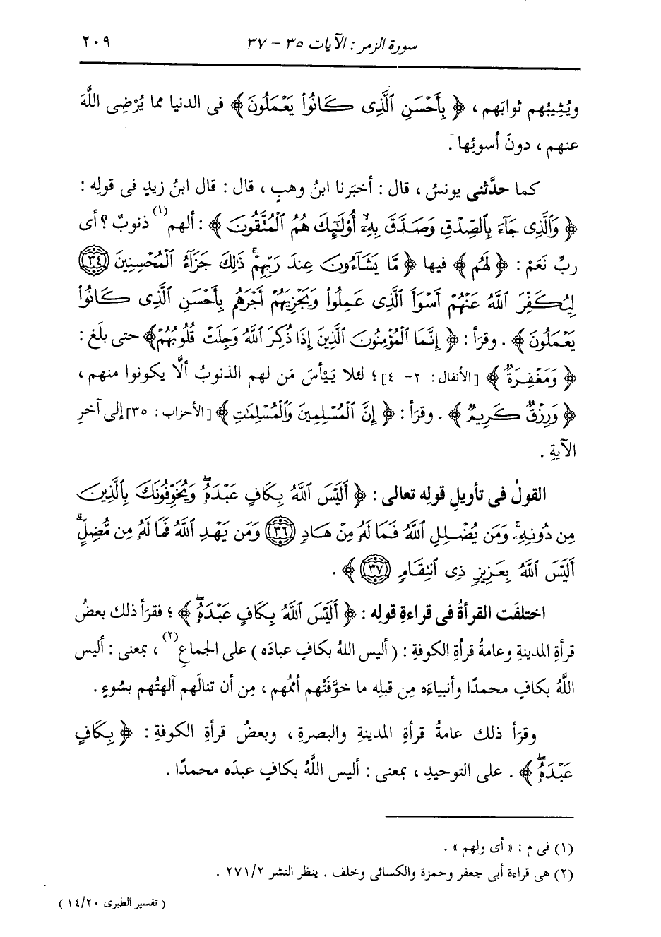 §الْقَوْلُ فِي تَأْوِيلِ قَوْلِهِ تَعَالَى: {أَلَيْسَ اللَّهُ بِكَافٍ عَبْدَهُ وَيُخَوِّفُونَكَ بِالَّذِينَ مِنْ دُونِهِ وَمَنْ يُضْلِلِ اللَّهُ فَمَا لَهُ مِنْ هَادٍ وَمَنْ يَهْدِ اللَّهُ فَمَا لَهُ مِنْ مُضِلٍّ أَلَيْسَ اللَّهُ بِعَزِيزٍ ذِي انْتِقَامٍ} [الزمر: 37] اخْتَلَفَتِ الْقُرَّاءُ فِي قِرَاءَةِ: {أَلَيْسَ اللَّهُ بِكَافٍ عَبْدَهُ} [الزمر: 36] فَقَرَأَ ذَلِكَ بَعْضُ قُرَّاءِ الْمَدِينَةِ وَعَامَّةُ قُرَّاءِ أَهْلِ الْكُوفَةِ: (أَلَيْسَ اللَّهُ بِكَافٍ عِبَادَهُ) عَلَى الْجِمَاعِ، بِمَعْنَى: أَلَيْسَ اللَّهُ بِكَافٍ مُحَمَّدًا وَأَنْبِيَاءَهُ مِنْ قَبْلِهِ مَا خَوَّفَتْهُمْ أُمَمُهُمْ مِنْ أَنْ تَنَالَهُمْ آلِهَتَهُمْ بِسُوءٍ؛ وَقَرَأَ ذَلِكَ عَامَّةُ قُرَّاءِ الْمَدِينَةِ وَالْبَصْرَةِ، وَبَعْضُ قُرَّاءِ الْكُوفَةِ: {بِكَافٍ عَبْدَهُ} [الزمر: 36] عَلَى التَّوْحِيدِ، بِمَعْنَى: أَلَيْسَ اللَّهُ بِكَافٍ عَبْدَهُ مُحَمَّدًا