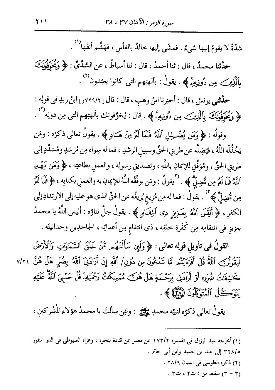 حَدَّثَنَا مُحَمَّدٌ، قَالَ: ثنا أَحْمَدُ، قَالَ: ثنا أَسْبَاطٌ، عَنِ السُّدِّيِّ، {§وَيُخَوِّفُونَكَ بِالَّذِينَ مِنْ دُونِهِ} [الزمر: 36] يَقُولُ: «بِآلِهَتِهِمُ الَّتِي كَانُوا يَعْبُدُونَ»