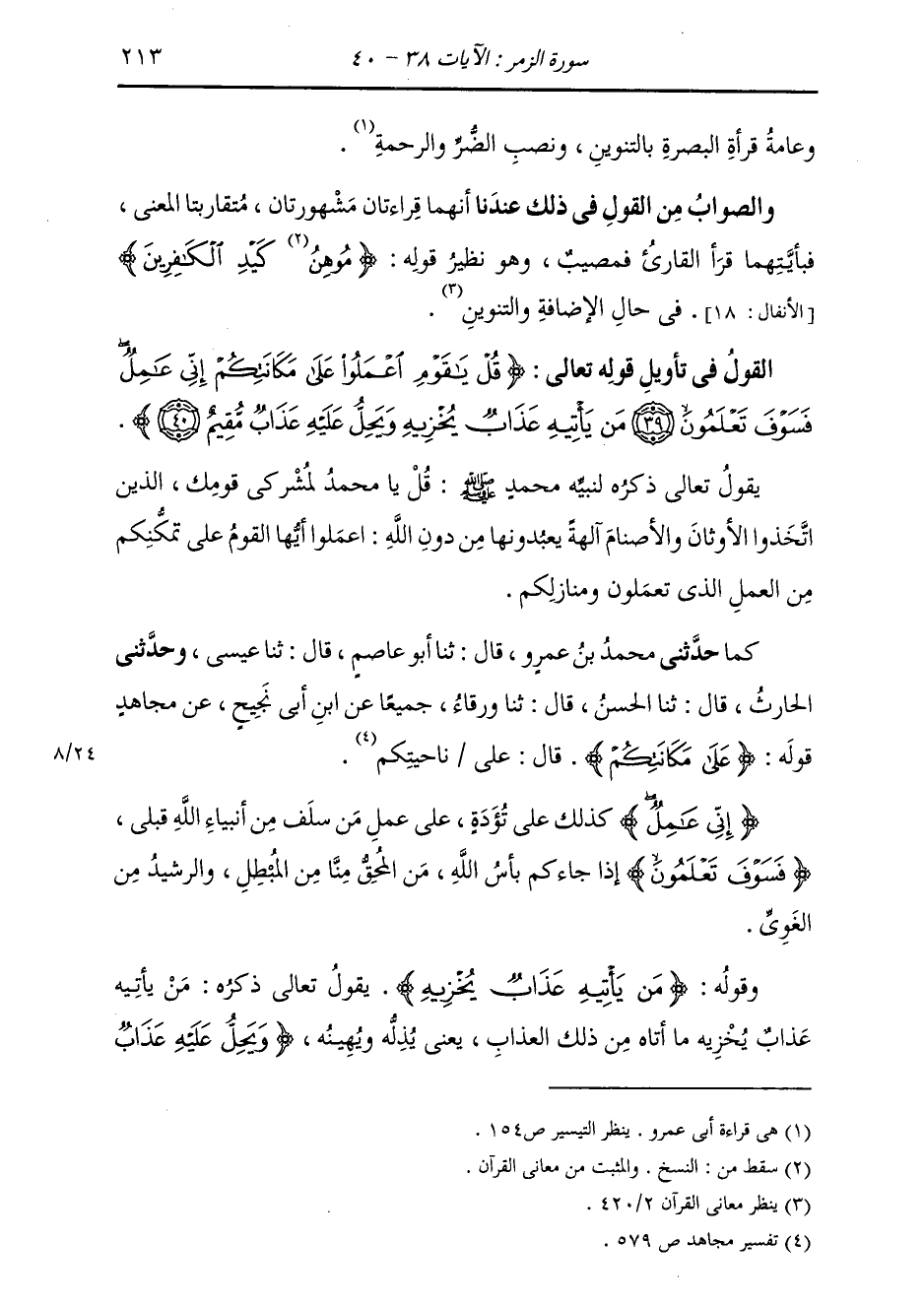 كَمَا: حَدَّثَنِي مُحَمَّدُ بْنُ عَمْرٍو، قَالَ: ثنا أَبُو عَاصِمٍ، قَالَ: ثنا عِيسَى، وَحَدَّثَنِي الْحَارِثُ، قَالَ: ثنا الْحَسَنُ، قَالَ: ثنا وَرْقَاءُ، جَمِيعًا عَنِ ابْنِ أَبِي نَجِيحٍ، عَنْ مُجَاهِدٍ، قَوْلُهُ: {عَلَى مَكَانَتِكُمْ} [الزمر: 39] قَالَ: " §عَلَى نَاحِيَتُكُمْ {إِنِّي عَامِلٌ} [الزمر: 39] كَذَلِكَ عَلَى تُؤَدَةٍ عَلَى عَمَلِ مَنْ سَلَفَ مِنْ أَنْبِيَاءِ اللَّهِ قَبْلِي {فَسَوْفَ تَعْلَمُونَ} [الزمر: 39] إِذَا جَاءَكُمْ بَأْسُ اللَّهِ، مَنِ الْمُحِقُّ مِنَّا مِنَ الْمُبْطِلِ، وَالرَّشِيدُ مِنَ الْغَوِيِّ "