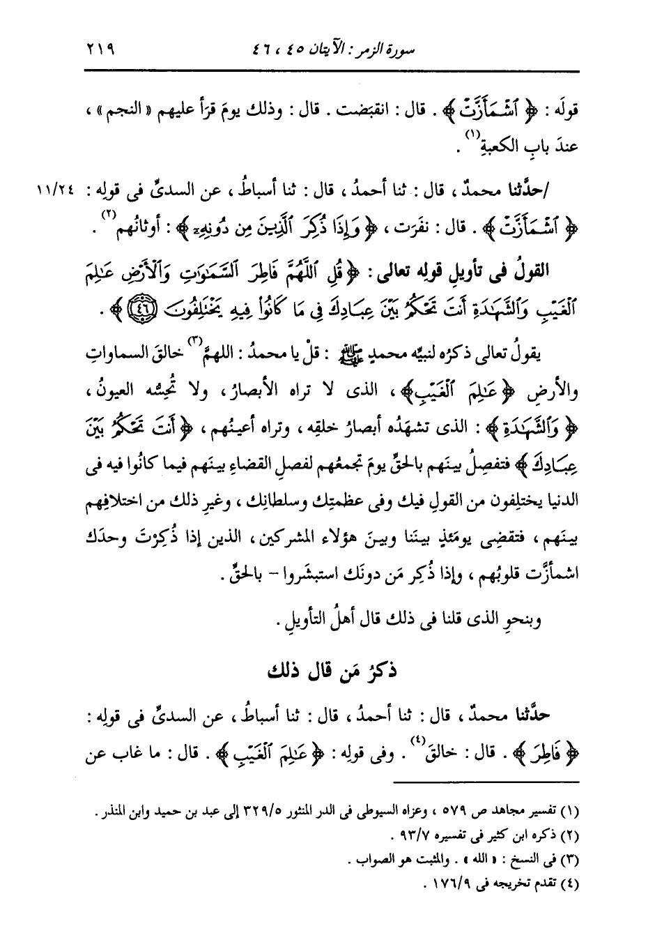 حَدَّثَنَا مُحَمَّدٌ، قَالَ: ثنا أَحْمَدُ، قَالَ: ثنا أَسْبَاطٌ، عَنِ السُّدِّيِّ، قَوْلُهُ: {§اشْمَأَزَّتْ} [الزمر: 45] قَالَ: «نَفَرَتْ» {وَإِذَا ذُكِرَ الَّذِينَ مِنْ دُونِهِ} [الزمر: 45] «أَوْثَانُهُمْ»