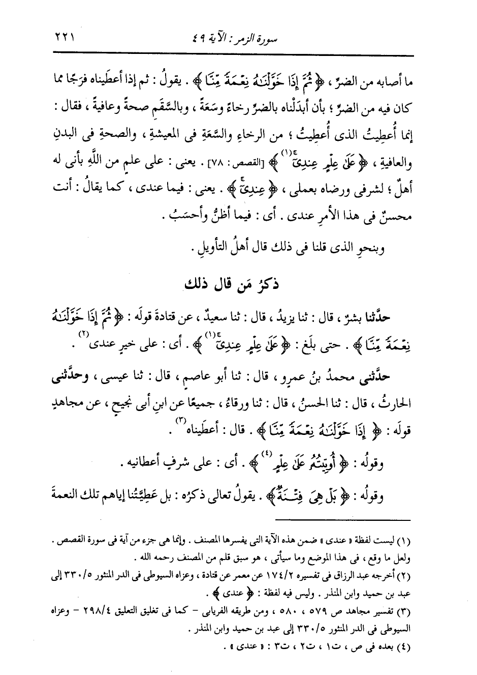 حَدَّثَنِي مُحَمَّدُ بْنُ عَمْرٍو، قَالَ: ثنا أَبُو عَاصِمٍ، قَالَ: ثنا عِيسَى، وَحَدَّثَنِي الْحَارِثُ، قَالَ: ثنا الْحَسَنُ، قَالَ: ثنا وَرْقَاءُ، جَمِيعًا عَنِ ابْنِ أَبِي نَجِيحٍ، عَنْ مُجَاهِدٍ، قَوْلُهُ: {§إِذَا خَوَّلْنَاهُ نِعْمَةً مِنَّا} [الزمر: 49] قَالَ: «أَعْطَيْنَاهُ»