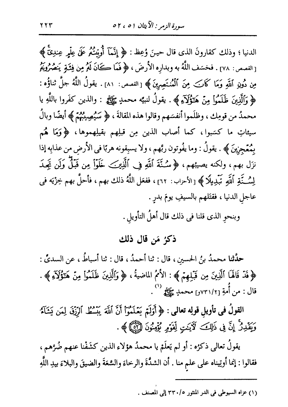 ذِكْرُ مَنْ قَالَا ذَلِكَ: حَدَّثَنَا مُحَمَّدُ بْنُ الْحُسَيْنِ، قَالَ: ثنا أَحْمَدُ، قَالَ: ثنا أَسْبَاطٌ، عَنِ السُّدِّيِّ، {§قَدْ قَالَهَا الَّذِينَ مِنْ قَبْلِهِمْ} [الزمر: 50] «الْأُمَمُ الْمَاضِيَةُ» {وَالَّذِينَ ظَلَمُوا} [الزمر: 51] " مِنْ هَؤُلَاءِ، قَالَ: مِنْ أُمَّةِ مُحَمَّدٍ صَلَّى اللهُ عَلَيْهِ وَسَلَّمَ "