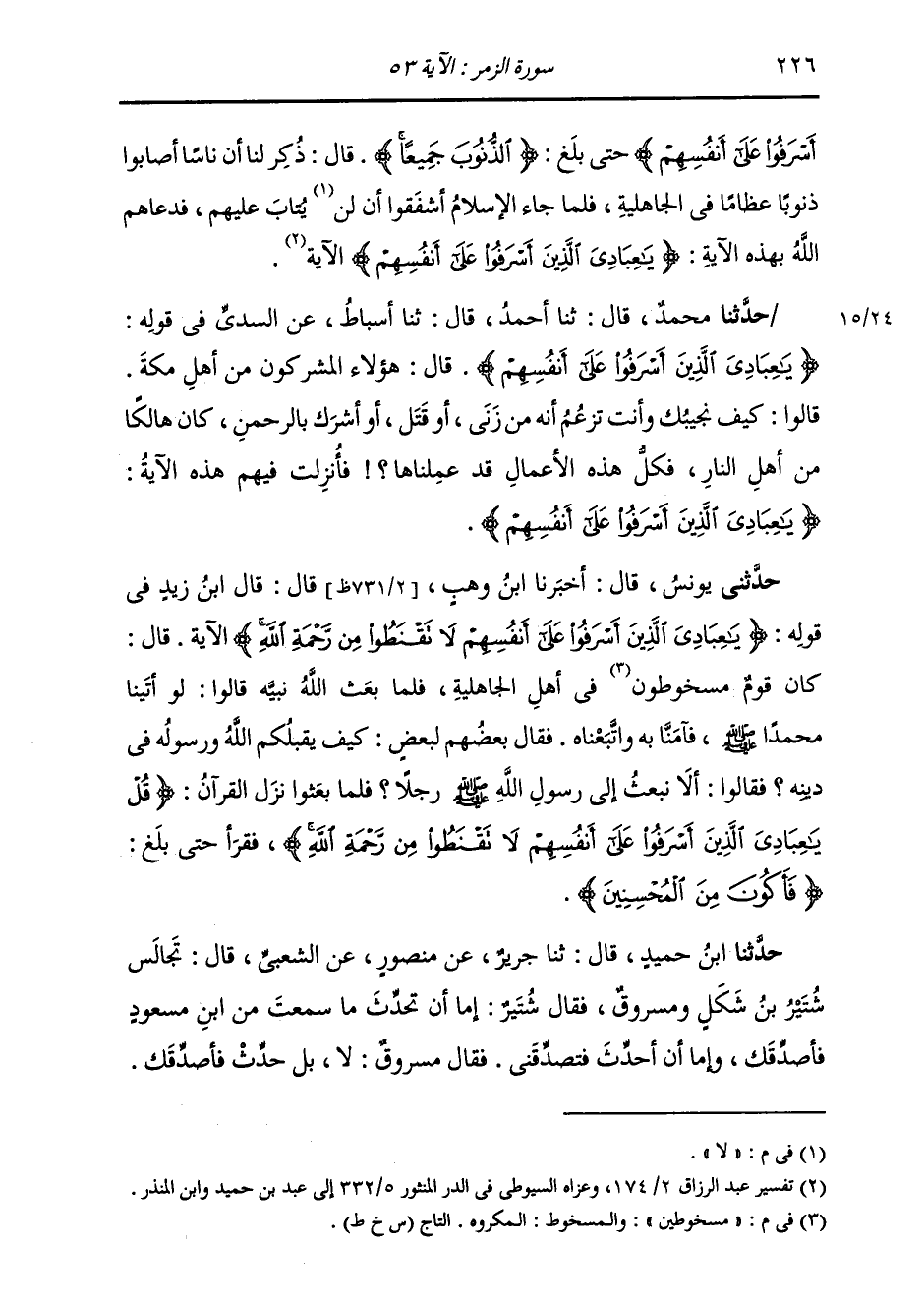 حَدَّثَنَا ابْنُ حُمَيْدٍ، قَالَ: ثنا جَرِيرٌ، عَنْ مَنْصُورٍ، عَنِ الشَّعْبِيِّ، قَالَ: تَجَالَسَ شُتَيْرُ بْنُ شَكَلٍ وَمَسْرُوقٌ فَقَالَ شُتَيْرٌ: إِمَّا أَنْ تُحَدِّثَ مَا سَمِعْتَ مِنَ ابْنِ مَسْعُودٍ فَأُصدِّقُكَ، وَإِمَّا أَنْ أُحَدِّثَ فَتُصدِّقُنِي فَقَالَ مَسْرُوقٌ: لَا بَلْ حَدِّثْ فَأُصدِّقُكَ، -[227]- فَقَالَ: سَمِعْتُ ابْنَ مَسْعُودٍ يَقُولُ: " إِنَّ §أَكْبَرَ آيَةٍ فَرَجًا فِي الْقُرْآنِ {يَا عِبَادِيَ الَّذِينَ أَسْرَفُوا عَلَى أَنْفُسِهِمْ لَا تَقْنَطُوا} [الزمر: 53] مِنْ رَحْمَةِ اللَّهِ فَقَالَ مَسْرُوقٌ: صدَقْتَ " وَقَالَ آخَرُونَ: بَلْ عُنِيَ بِذَلِكَ أَهْلُ الْإِسْلَامِ، وَقَالُوا: تَأْوِيلُ الْكَلَامِ: إِنَّ اللَّهَ يَغْفِرُ الذُّنُوبَ جَمِيعًا لِمَنْ يَشَاءُ، قَالُوا: وَهِيَ كَذَلِكَ فِي مُصْحَفِ عَبْدِ اللَّهِ، وَقَالُوا: إِنَّمَا نَزَلَتْ هَذِهِ الْآيَةُ فِي قَوْمٍ صَدَّهُمُ الْمُشْرِكُونَ عَنِ الْهِجْرَةِ وَفَتَنُوهُمْ، فَأَشْفَقُوا أَنْ لَا يَكُونَ لَهُمْ تَوْبَةٌ
